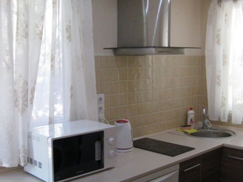 В домике: 1 комната (12 кв.м.): диван, стол, стулья, кондиционер. 2 комната (18 кв.м.): двухместная кровать, комод, шкаф, тумбочки, телевизор, кондиционер. 3 комната (16 кв.м.): двухместная кровать, диван, комод, шкаф, тумбочки, кондиционер. Кухня (5 кв.м.): укомплектована всем необходимым.