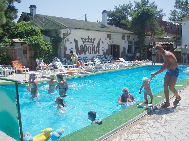 Отель «Корона» расположен на одной из центральных улиц города Евпатория. В пешей доступности находится аквапарк и дельфинарий, городской парк развлечений, знаменитая набережная с её магазинами, лавками, ресторанами и кафе. В 500 метрах от отеля «Корона» расположен песчаный городской пляж.