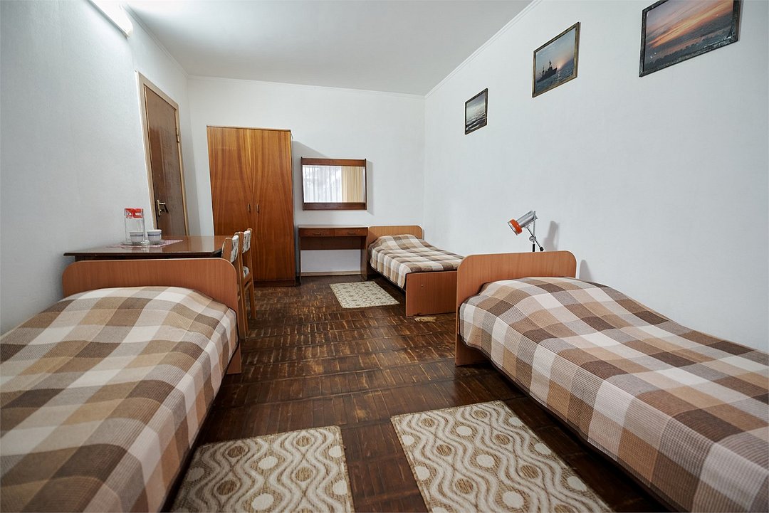 Один из двух номеров в блоке с общим сан. узлом и летним душем. В цену включено трехразовое питание на человека! Однокомнатный номер на 2 или 3 основных места. Площадь номера - от 12 до 18 кв.м. Основные места - две или три односпальные кровати. Номера данной категории располагаются на 1 и 4 этажах. Вид из номеров на прилегающую парковую территорию. Дополнительное место-раскладушка возможно установить только в номере с тремя кроватями.Услуги и удобства