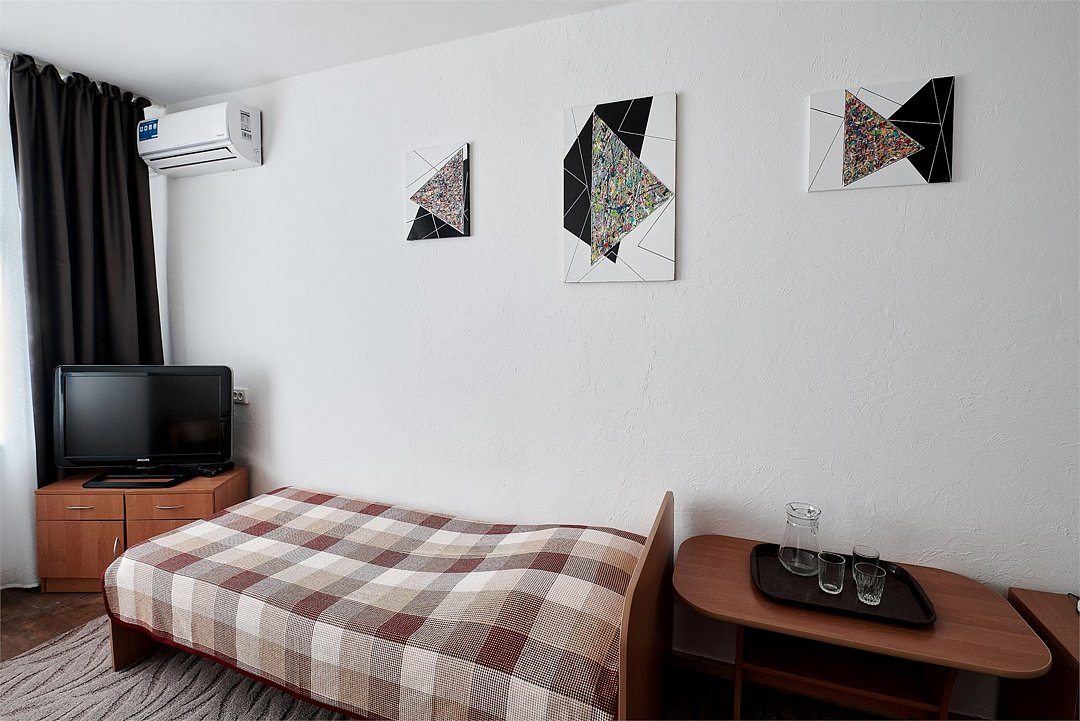 Уютный однокомнатный номер. В цену включено трехразовое питание! Номер на 1 основное место. Площадь номера - 9 кв.м. Основное место - односпальная кровать или диван. Номера данной категории располагаются на 1-4 этажах. Вид с верхних этажей на море. Вид с первых этажей на сад. В некоторых номерах возможна установка детской кроватки.Услуги и удобства