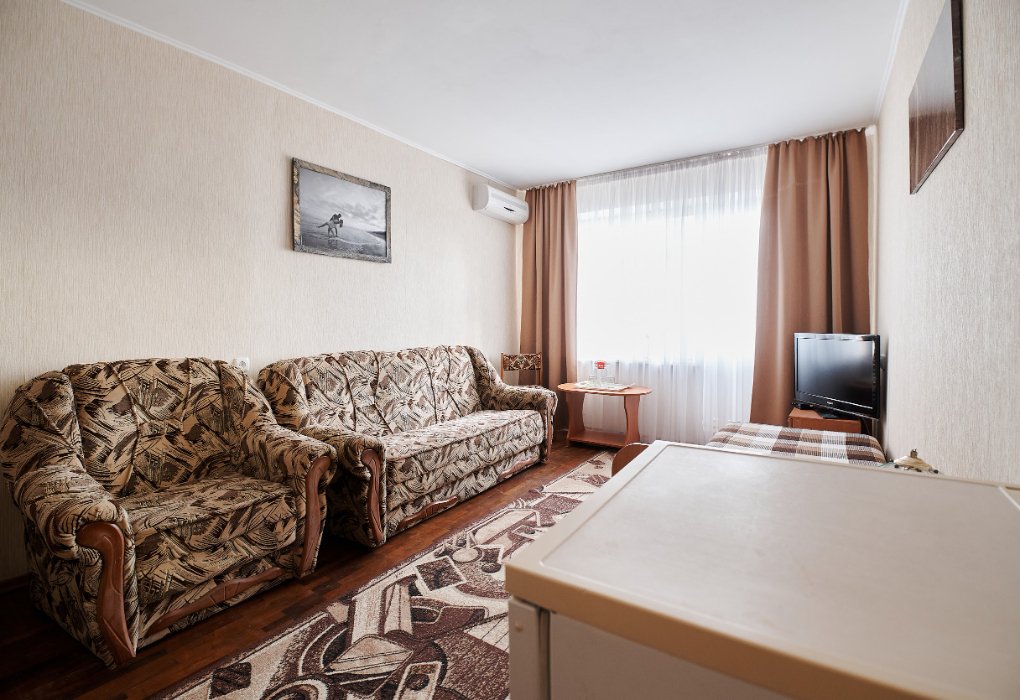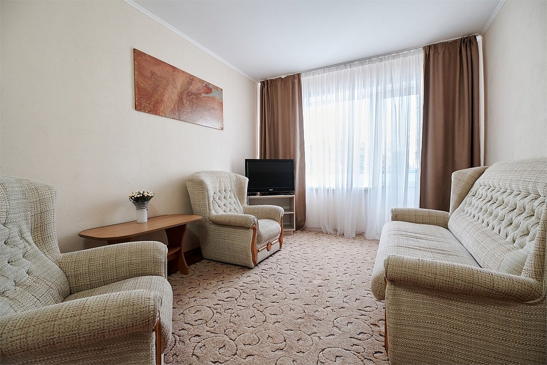Двухкомнатный или трёхкомнатный номер. В цену включено трехразовое питание - шведский стол! Номера на 3 основных места и 1 дополнительное (евро раскладушка). Площадь номера - от 34 кв.м. Основные и дополнительные места - двуспальная кровать (не раздвигается), диван. Дополнительное место - совместный диван или евро раскладушка. Номера данной категории располагаются на 1-4 этажах. Вид с верхних этажей на прилегающую парковую территорию и детскую площадку. Вид с первых этажей на сад.Услуги и удобства