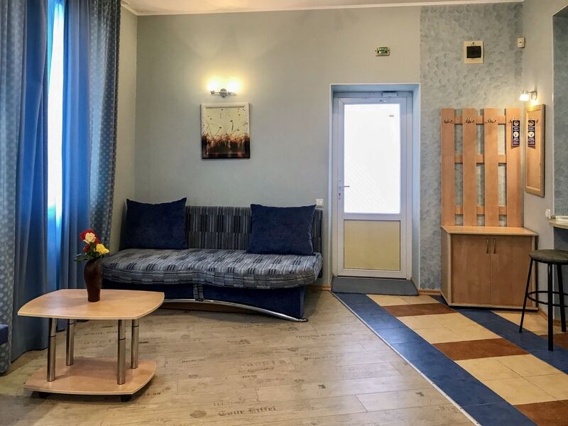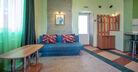 В номере спальные места: 1) односпальный диван-кровать и раскладной двуспальный диван-кровать, 2) двуспальная кровать и дополнительное место - второй ярус над изголовьем кровати. ВНИМАНИЕ! Вид из окна в общий коридор.