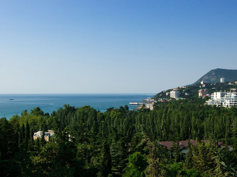 — балкон и окна с видом на Алушту, Крымские горы или Приморский парк;