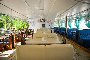 В основном зале в вечернее время звучит танцевальная музыка, есть отдельный зал с караоке (единственный на набережной).