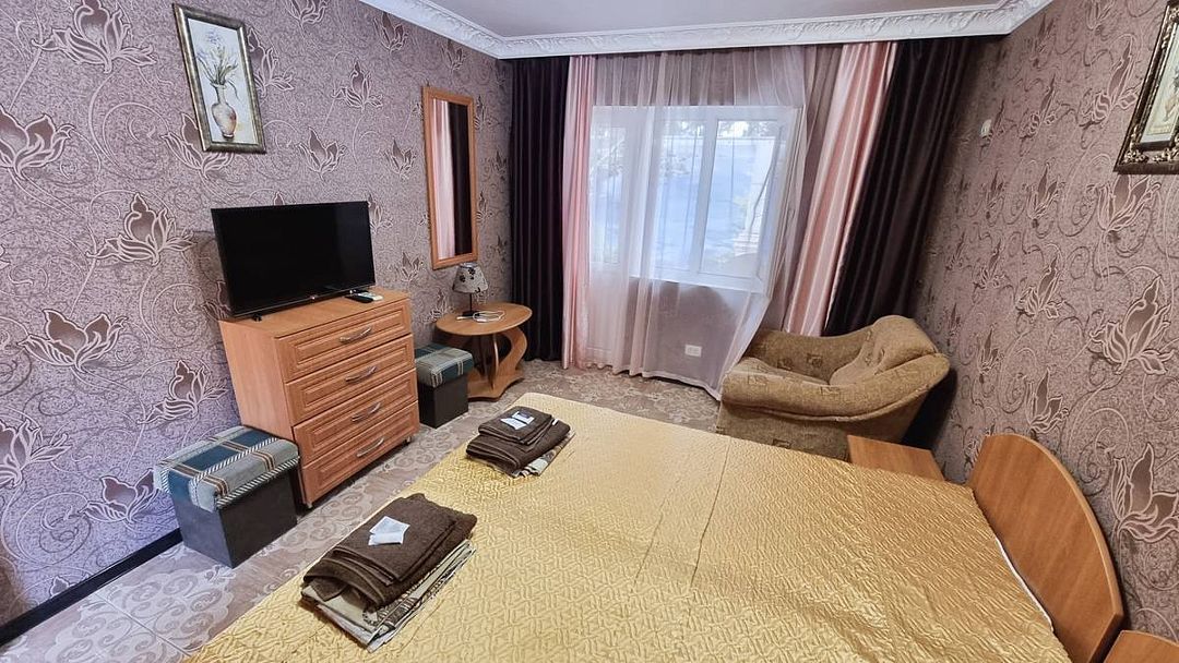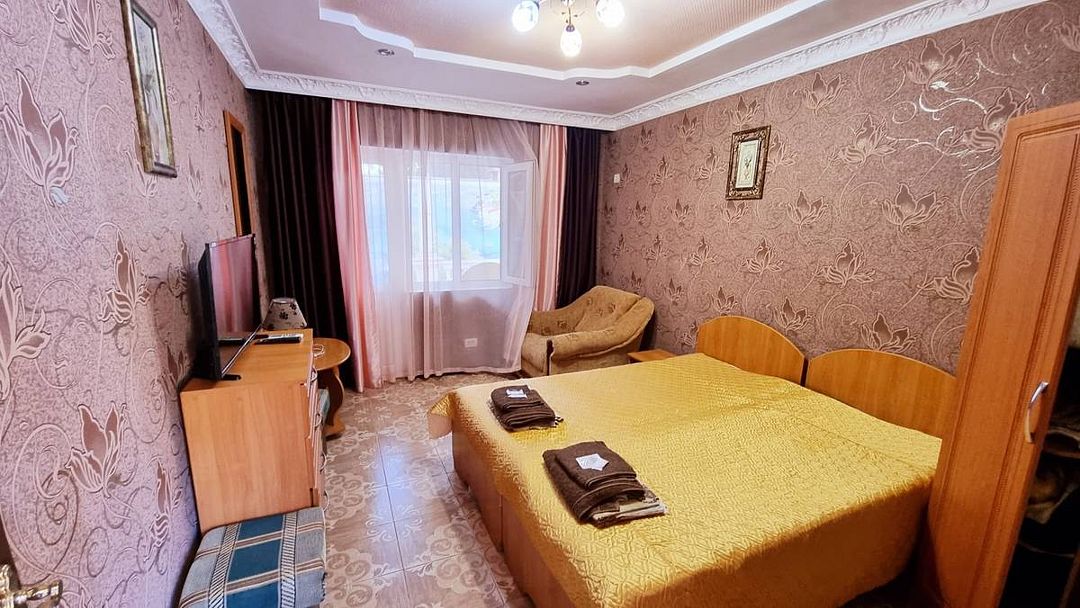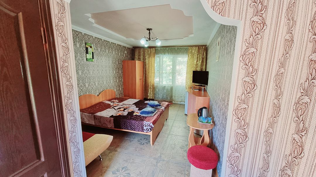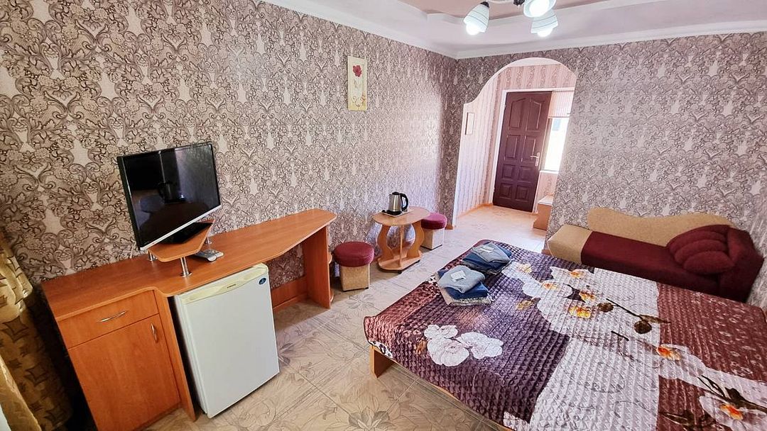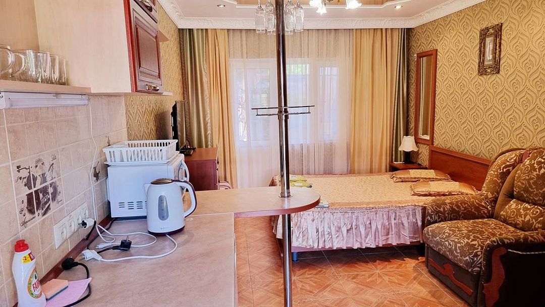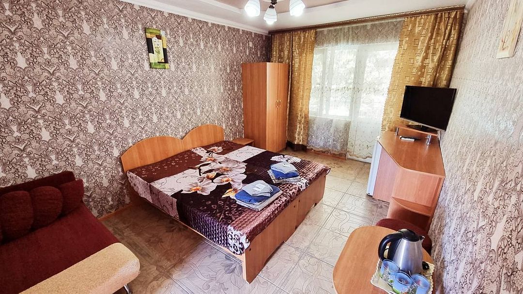 Если Вы цените уют и желаете наслаждаться не только красивыми видами и летним солнцем, предлагаем Вашему вниманию комфортный номер «Семейный с кухней», просторный и светлый. Готовый принять большую семью или дружную компанию, он состоит из: Уютной спальни: 12м2, с вместительным шкафом, мягкими пуфами, большой кроватью, телевизором, кондиционером, столиком. Комфортабельной гостиной: 18м2, с раскладывающимся диваном, удобным шкафом, небольшими пуфами и телевизором(плазма 32 дюйма) и кондиционером, 2 кресла-кровати, сейф. Просторной кухни: 8м2, с навесными шкафами, необходимой посудой, вместительным обеденным столом, мойкой, холодильником, электрочайником, микроволновой печью, электроплитой. Европейского санузла: 4м2, с душем, умывальником и туалетом; горячая вода подается круглосуточно. Вместительной лоджии: 10м2, со столом и стульями. В этом номере, рассчитанном на размещение 3-4х взрослых постояльцев и 1-2х детей (возрастом до 6 лет), работает два кондиционера, имеется спутниковое TV, комфортная мягкая мебель, надежный сейф, WiFi доступ к сети интернет. Здесь можно в прохладе отдохнуть от летнего солнца, самостоятельно приготовить обед и посмотреть любимую телепередачу или новый фильм. Стоимость включает: проживание в номере, семейный с кухней, пользование пляжем, подключение к сети WiFi. Смена белья: каждые 5-6 дней Питание: От комплексного до шведского стола, в расположенных неподалеку столовых, оплачивается отдельно. Возможен заказ комплексного 3-разового питания, или завтрака, обеда или ужина в отдельности. Благодаря наличию оборудованной кухни, имеется возможность готовить самостоятельно. Питание мы организуем по вашему прибытию, вы сами выберите какое Вам подойдет, по цене, качеству и т.д. Рядом десяток кафе-баров, которые готовят по меню "Домашняя кухня", продуктовые магазины, рынок и т.д. Вода: круглосуточно имеется горячая гелио и бойлер.Спальные места