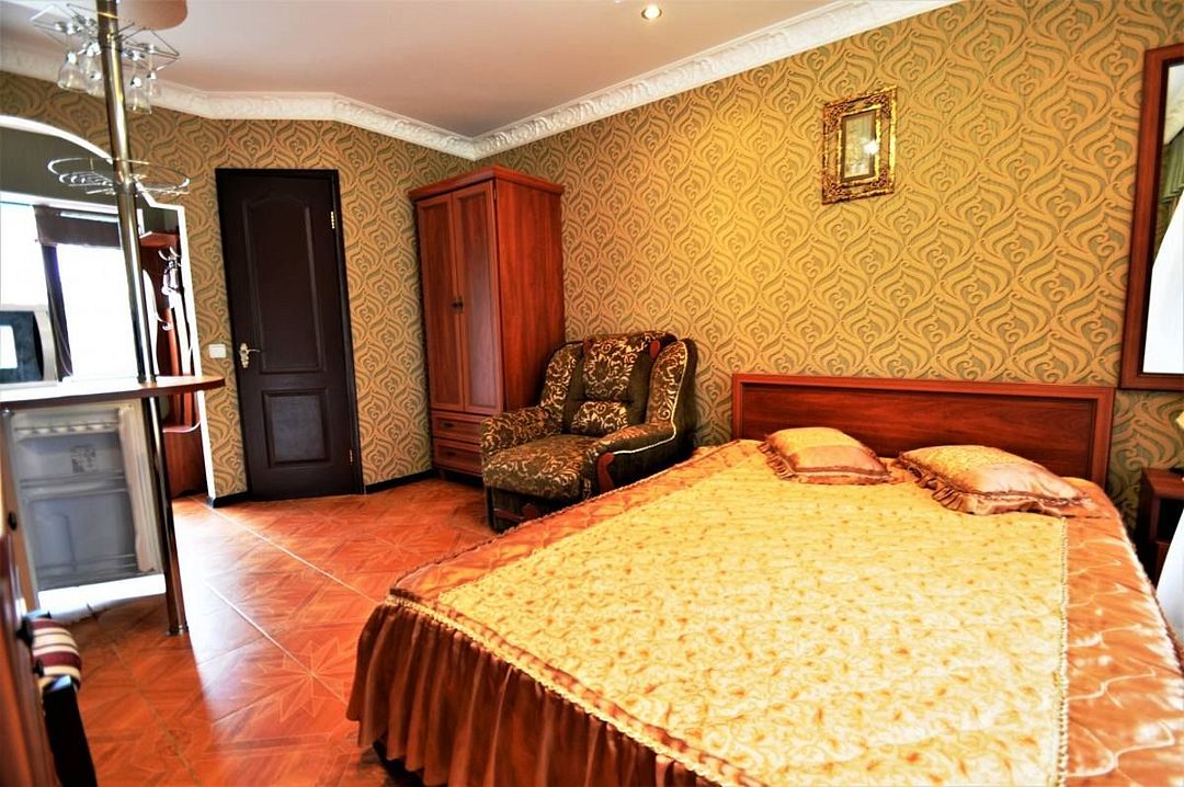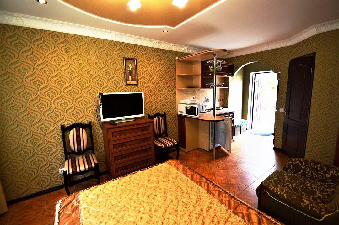 Если Вы желаете снять номер с отличными условиями, но при этом планируете сэкономить, рекомендуем Вам обратить внимание на двухместные апартаменты полулюкс комфорт с кухней нашего гостевого дома. Каждый из таких номеров состоит из: Просторной комнаты (16м2, с мягкой мебелью, двуспальной кроватью, столиком, пуфами, креслом-кроватью, спутниковым ТВ(плазма 32 дюйма), кондиционером, доступ к интернету WiFi). Оборудованной кухни (с холодильником, микроволновой печью, электроплитой, необходимым набором посуды). Стандартным санузлом (с душем, умывальником и туалетом). Вместительным балконом (со столиком и стульями). Каждый из таких номеров, рассчитанных на размещение 2 взрослых гостей и 1 ребенка(до 10 лет), отличается уникальным интерьером и привлекает уютной атмосферой. Он отлично подойдет для комфортного отдыха, т.к. после жаркого солнца позволит подышать прохладным кондиционированным воздухом, подарит возможность насладиться любимым фильмом или телепередачей, а если Вы путешествуете с ребенком - приготовить домашнюю пищу для малыша. В стоимость входят: проживание, пользование услугами пляжа, доступ в интернет. Смена белья: каждые 5-6 дней Питание: От комплексного до шведского стола, в расположенных неподалеку столовых, оплачивается отдельно. Возможен заказ комплексного 3-разового питания, или завтрака, обеда или ужина в отдельности. Благодаря наличию оборудованной кухни, имеется возможность готовить самостоятельно. Питание мы организуем по вашему прибытию, вы сами выберите какое Вам подойдет, по цене, качеству и т.д. Рядом десяток кафе-баров, которые готовят по меню "Домашняя кухня", продуктовые магазины, рынок и т.д. Вода: горячая – круглосуточно гелио и бойлер. Инфраструктура: у пансионата имеется собственный пляж (песочный, мелко-галечный, оборудованный специальными навесами и летним душем); неподалеку располагаются магазины и местный фруктовый рынок, кафе, бары, танцплощадка; имеется возможность получения качественных медицинских услуг, массажа, туристических услуг (приобретение и заказ билетов на экскурсии, пешие и морские туристические прогулки, бронирование авиа и ж/д билетов). Пляж: чистый, мелко-галечный, расположенный всего в 150м от территории пансионата, самый протяженный и широкий на побережье. ВНИМАНИЕ! Пансионат "Орхидея" размещает гостей, на отдых, вместе со своими домашними питомцами, в данной категории номера. Правила и обязанности, читаем: Правила проживания с домашними питомцами в пансионате «ОРХИДЕЯ» Правила поселения: Расчетное время: 10-00 (выехать необходимо до 10-00) Заезд: с 12-00 (можно ранее, если имеется свободный убранный номер) Дети: принимаются без ограничений по возрасту.Спальные места