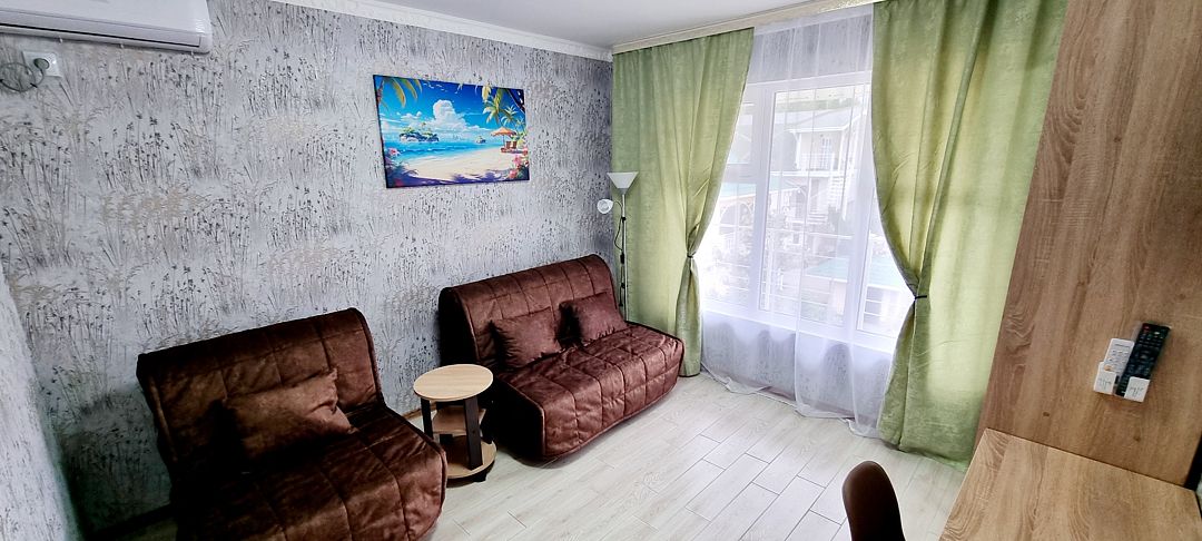 Если вы планируете отдых у моря в хорошем, новом, видовом номере, дружной семьей, то мы вам предлагаем НОВИНКУ сезона 2025 года, в пансионате Орхидея - Двухкомнатные номер с кухней и большой видовой террасой. Площадь номера 60 м.кв. Номер расположен на третьем этаже(подъем на этаж по удобной, винтовой лестнице) и оборудованный максимумом необходимой мебели и современной техникой, он поразит своим комфортом и практически домашним уютом. Состоит он из: Двух комфортабельных комнат (каждая 12м2, изолированы одна от другой, каждая меблирована шкафами, комфортными кроватями, и диванами, современной мягкой мебелью, пуфами, кресло-кроватями, а также телевизорами со спутниковым TV(в каждой комнате плазма 43 дюйма), в каждой комнате кондиционер, имеется доступ к WiFi интернету). Из спальни выходит балкон, с видом на море(на балконе комплект из столика и стульев). Из гостевой комнаты открывается вид на уютный двор, горы и Канаку. Кухня - большая отдельная комната и оборудована: 2-х камерным холодильником, микроволновой печью, электроплитой, обеденным столом и стульями, мойкой, полным набором необходимой посуды, кастрюль, сковородок и столовых принадлежностей). Европейского санузла (с душем, умывальником, горячей водой и туалетом, стиральной машинкой). Лоджия с видом на море, является продолжением кухни, что позволяет проводить время за обедом, ужином или утренним чаепитием, наслаждаясь морским видом. Оборудована садовой мебелью, столом. Такие апартаменты позволяют с комфортом разместить 3-4-х взрослых гостей и 1-2 ребенка детей(до 10 лет), предоставив максимальное количество удобств для полноценного отдыха у моря. Стильный интерьер, качественное, новое наполнение и наличие необходимой мебели и техники даст вам возможность расслабиться после жаркого дня и зарядиться энергией перед вечерней прогулкой или долгой экскурсией. Смена белья: каждые 5-6 дней В стоимость уже включено: проживание, посещение пляжа, WiFi Питание: Выбор за вами, от комплексного до домашней кухни, в расположенных неподалеку столовых, оплачивается отдельно. Возможен заказ комплексного 3-разового питания, или завтрака, обеда или ужина в отдельности. Питание вы сами выберите какое Вам подойдет, по цене, качеству и т.д. Благодаря наличию оборудованной кухни, у вас есть возможность готовить самостоятельно. Радом есть десяток кафе-баров, которые готовят по меню "Домашняя кухня", а также продуктовые магазины, рынок и т.д....все в шаговой доступности. Вода: горячая, холодная круглосуточно, бойлер.Спальные места
