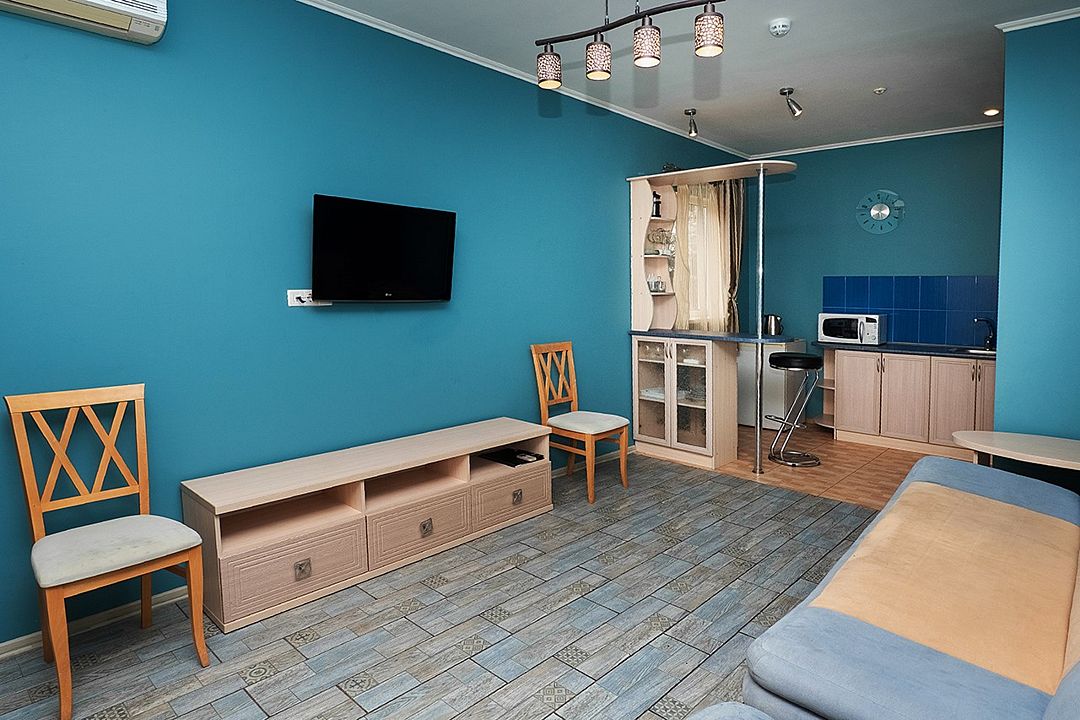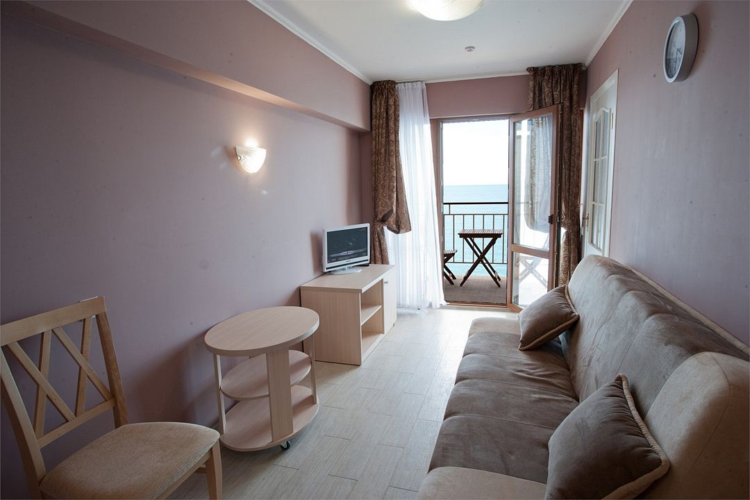 Номер у нас был просто шикарный, особенно по меркам старого номерного фонда (4 этаж морского корпуса). Это чуть ли не самый дорогой номер в «Актере», но он того стоит. Студия 28 кв. метров. Нормальный санузел (только лампочка ну очень слабая, полумрак). Вода есть всегда, и горячая, и холодная, отличный напор. На полу номера симпатичная плитка. Кондиционер (это есть только в этом корпусе, по-моему). И шикарные окна в пол выходят на огромную лоджию. Там два лежака, столик со стульчиками и большая сушилка для белья. Все необходимое. Чайник, мини-кухня, правда без микроволновки, но, по крайней мере, есть где помыть и нарезать фрукты, купленные в 200х метрах от корпуса в парке или на верхней дороге. Несколько тарелок, столовые приборы. В принципе, все есть. Даже штопор, а как же, винный край )). В этом номера есть халаты, тапочки, гель для душа, шампунь, мыло. Туалетная бумага нормальная.