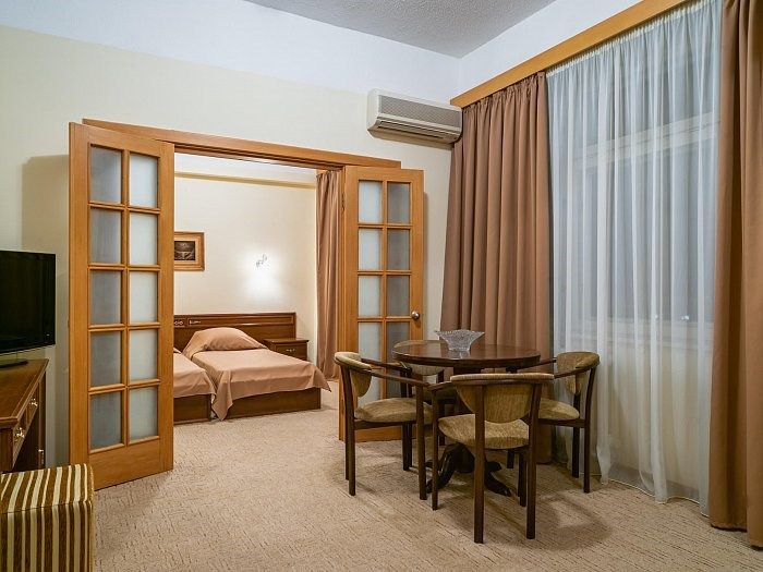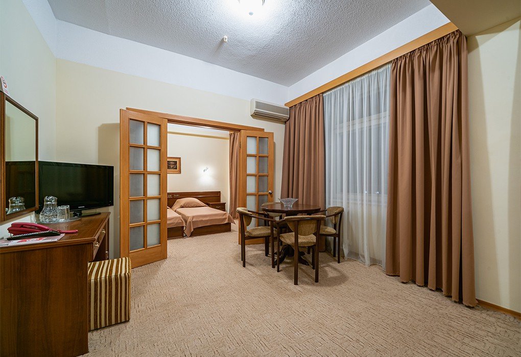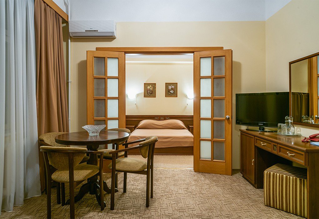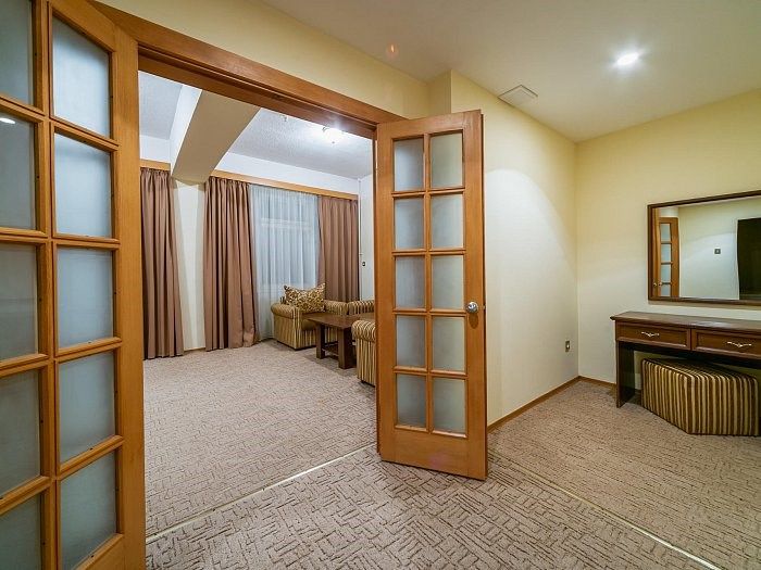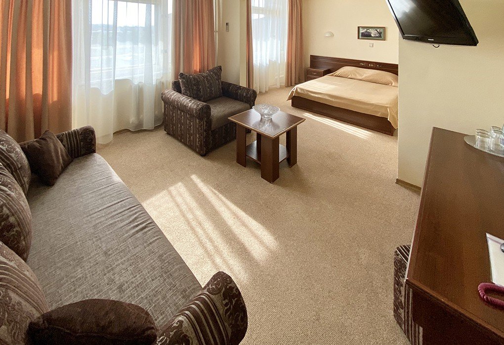 «Люкс» представляет собой двухкомнатный номер с балконом. Ванная комната оснащена джакузи. Великолепно подойдет для ценителей комфорта, современного дизайна и прекрасных видов. В номере есть все необходимое для комфортного проживания.Услуги и удобства