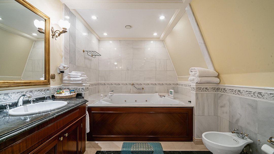 кабельное телевидение, Wi-Fi, телефон, кондиционер, светильник, халаты, банные полотенца, гигиенические средства, балкон с красивым видом, двуспальная кровать, стулья, шкаф для одежды, обеденный стол, зеркало, раковина, мягкая мебель, вид на море, кулер на этаже, кресло, туалетный столик, туалет, телевизор с плоским экраном, мини-холодильник, пуфик, джакузи, без питомцевВ номере