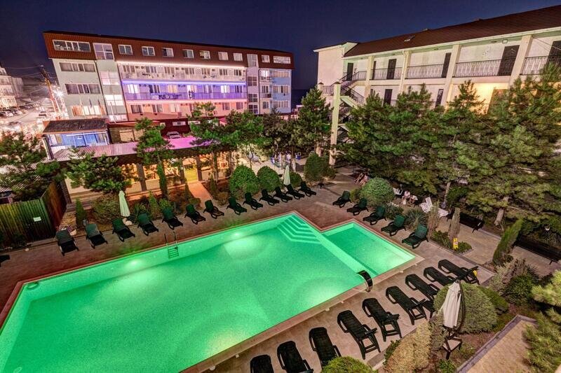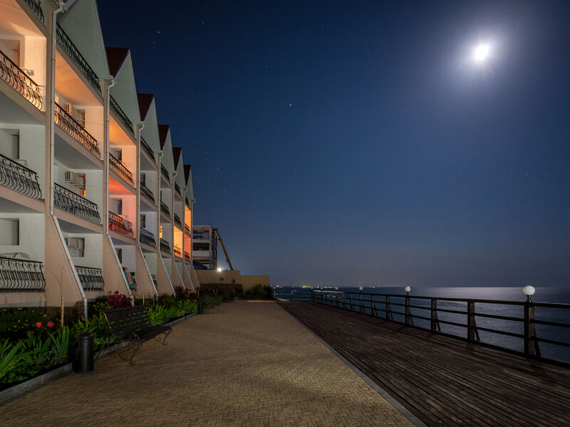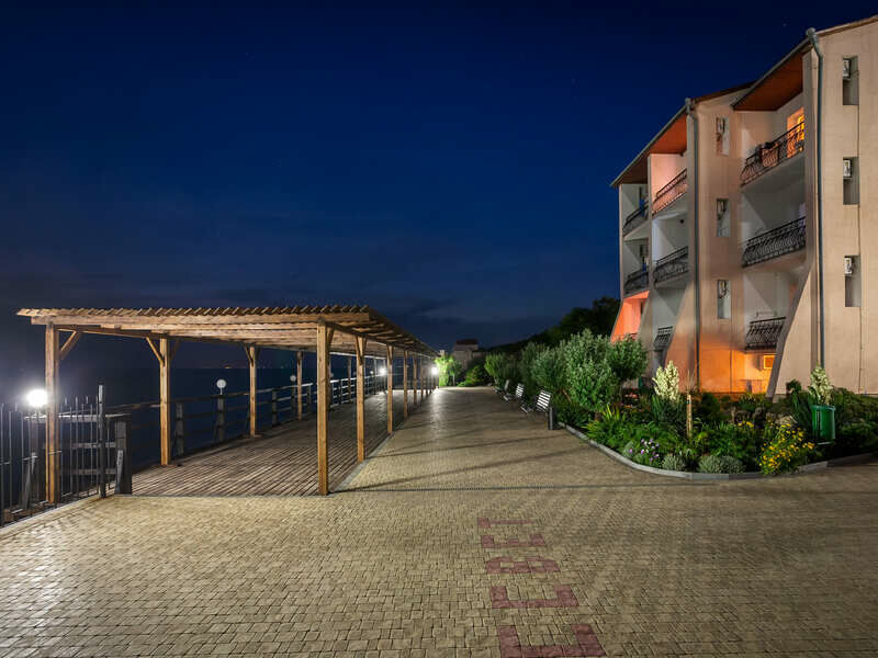 Пансионат расположен на возвышенности поселка Николаевка, с которой открывается потрясающий вид на Черное море. До Симферополя – 40 км, там же находится ближайший аэропорт и ж/д вокзал. Центр цивилизации поселка – Каламитский залив, в котором до утра работают бары, рестораны и всевозможные развлечения.