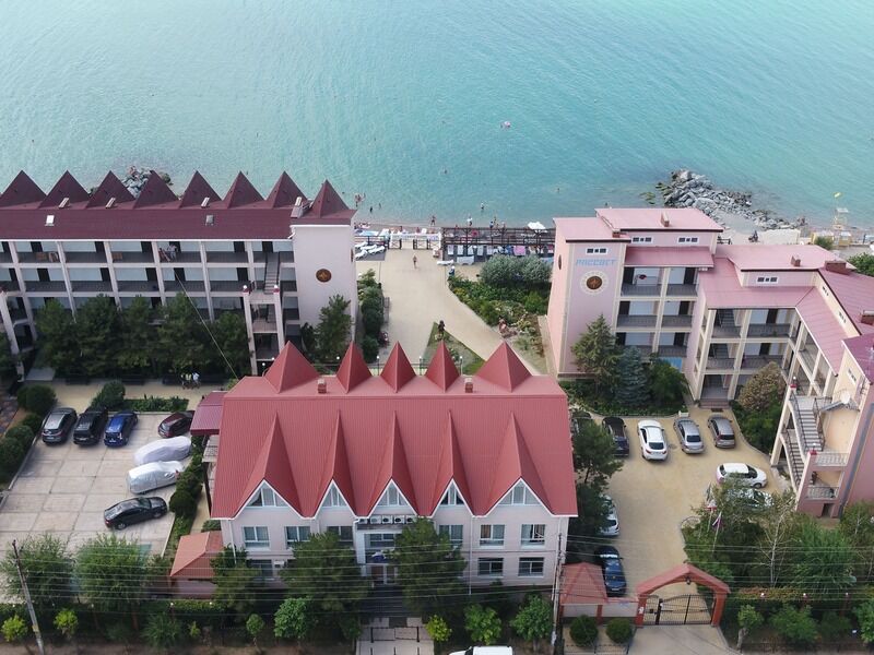 Сам пансионат находится в отдаленной части поселка. «Рассвет» владеет собственной обширной территорией, засаженной цветочными клумбами и пышной зеленью. Комплекс состоит из нескольких 3-х этажных зданий, расположенных в 50 м от моря. Пляж песчано-галечный, оборудован кабинками для переодевания и пунктами проката шезлонгов.
