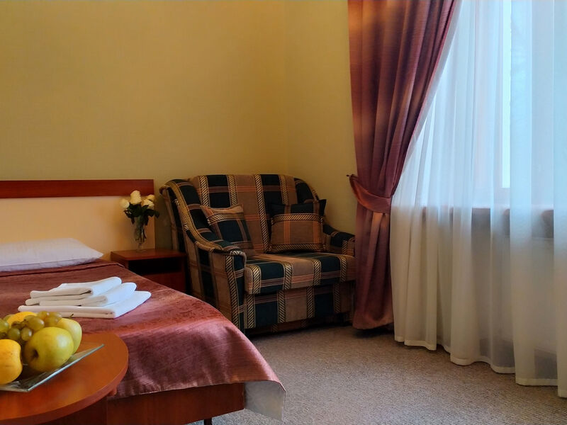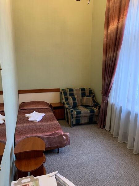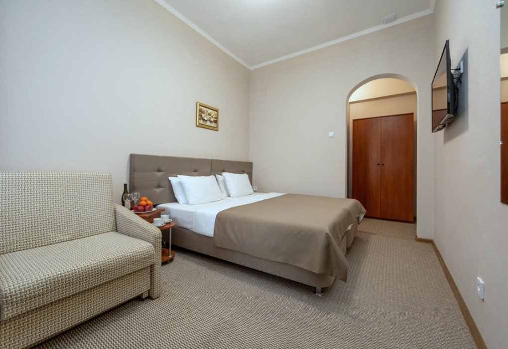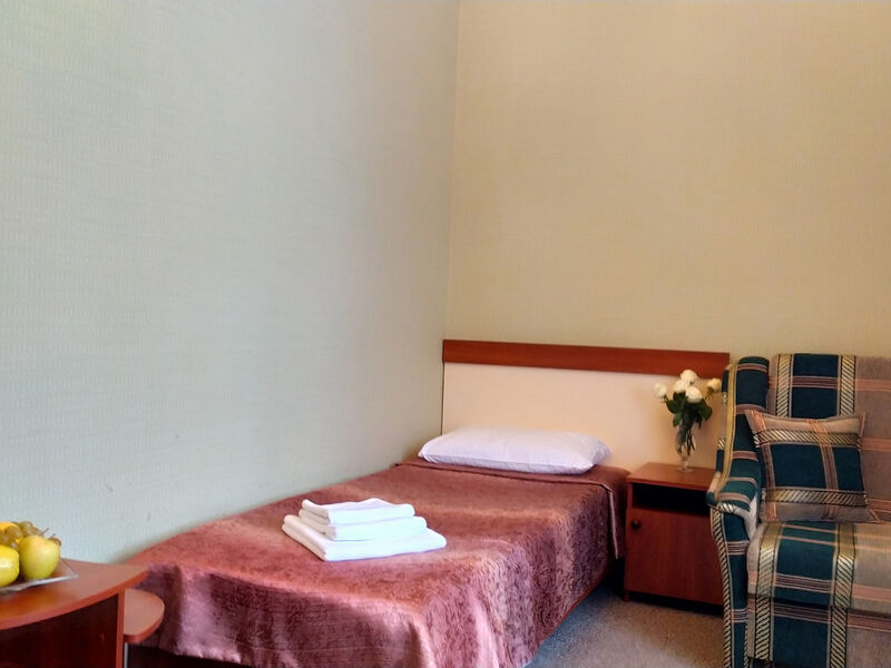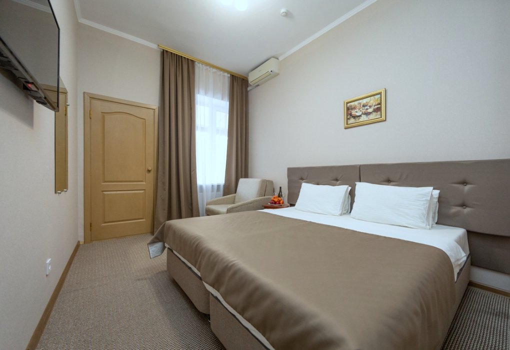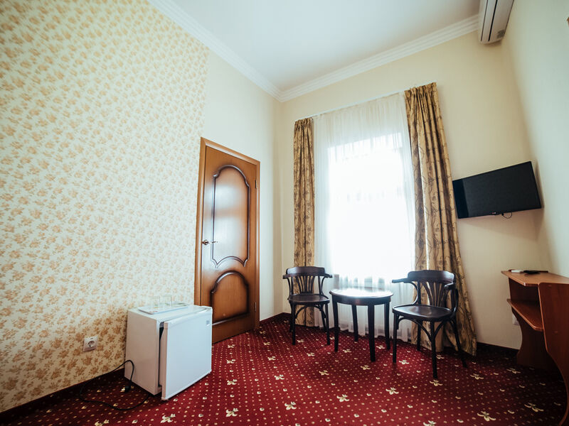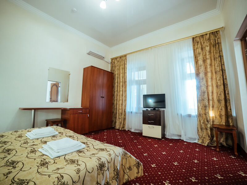 Однокомнатный двухместный номер. Общая площадь 15 м2. В номере: две односпальные кровати с возможностью объединения, кресло-кровать, одёжный шкаф, прикроватные тумбочки, кондиционер, холодильник, телевизор, сейф, электрочайник, Wi-Fi. Холодное и горячее водоснабжение круглосуточно. Возможно размещение на дополнительном месте. Дополнительным местом в номере является кресло-кровать или еврораскладушка. При размещении с маленькими детьми, бесплатно устанавливается детская кроватка. Все номера данной категории расположены на первом этаже с отдельным входом.Услуги и удобства