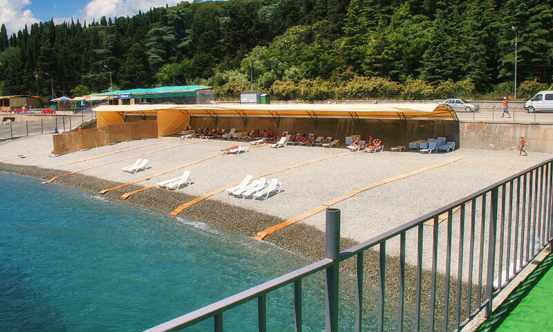 Пляж галечный, широкий. Вход в море постепенный, по гальке. На пляже работает матрос–спасатель.
