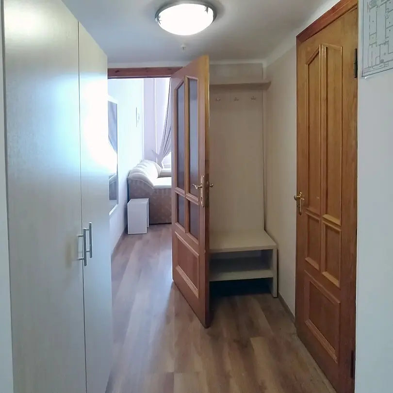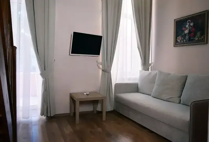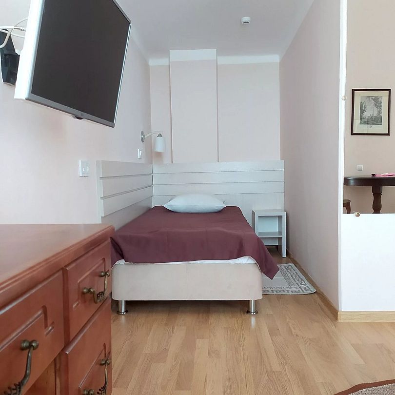 Номер с удобствами. На первом этаже – маленькая комната-спальня с одной односпальной кроватью и холл, на втором этаже спальня с двуспальной кроватью.