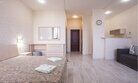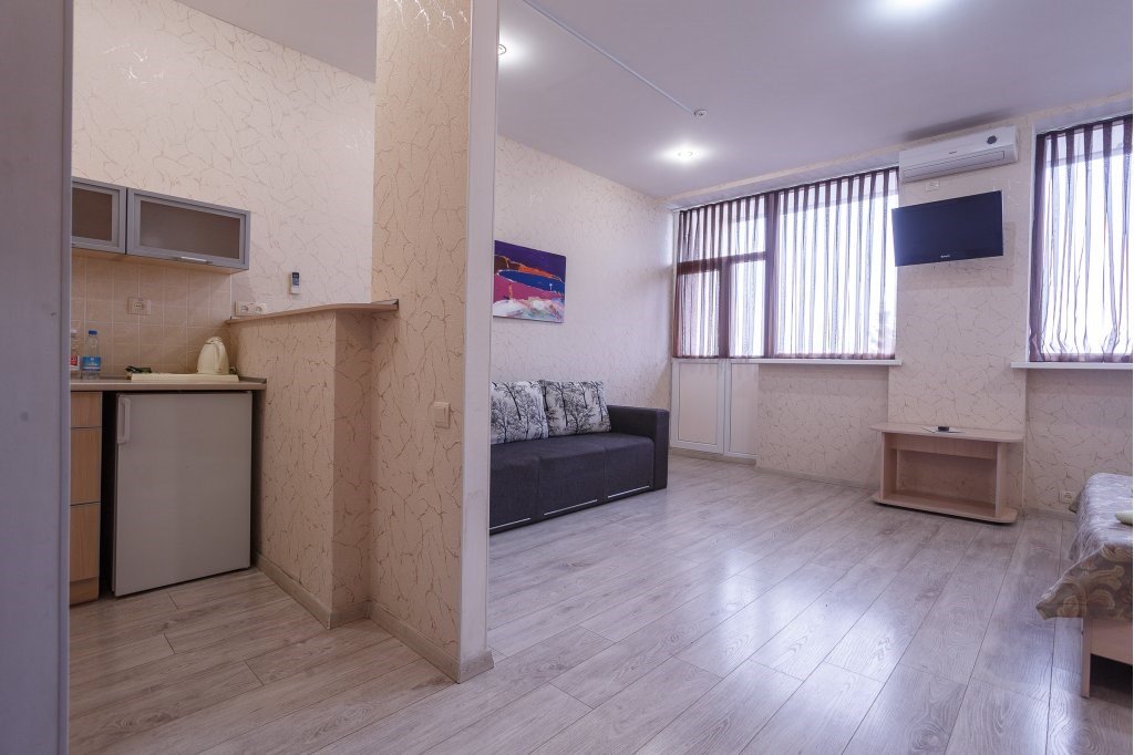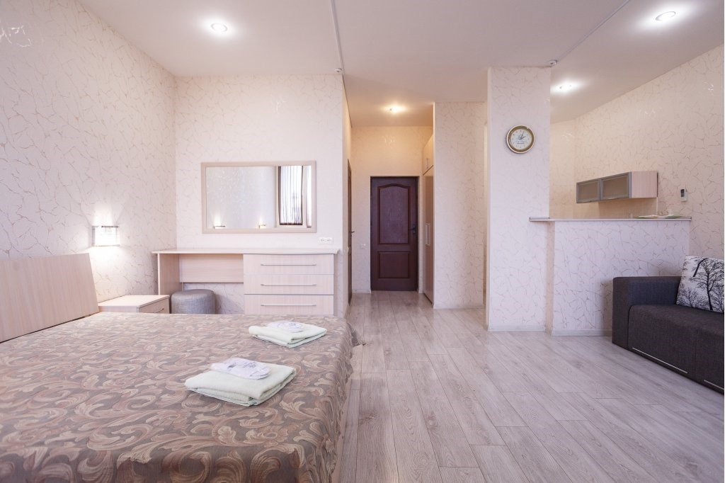 С балкона номера категории «Люкс-студио» открывается великолепный вид на парк и море или бассейн и море. В номере может разместиться до 5 человек. Номер состоит из 1 просторной комнаты с мини-кухней. Предусмотрен индивидуальный санузел с ванной, круглосуточная подача горячей и холодной воды (установлен бойлер), кондиционер, холодильник, телевизор, сейф, фен.Услуги и удобства
