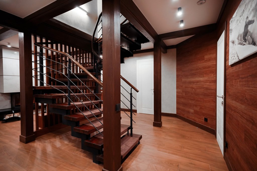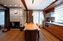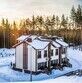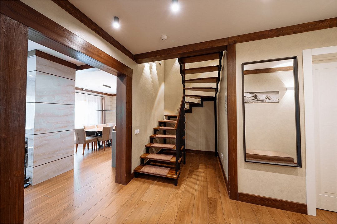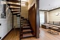 - на первом этаже коттеджа расположены современная кухня с премиальной техникой NEFF Liebherr, гостиная с камином, телевизором и обеденной зоной, терраса, сауна, сушильный шкаф;