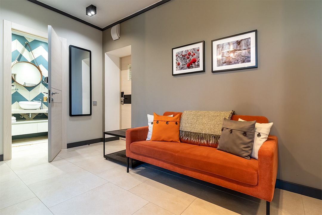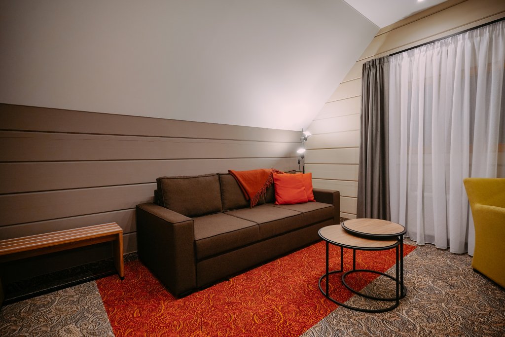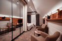 Номер также располагает комфортабельной зоной гостиной с диваном, и ЖК- телевизором*. Гостям предоставляются халаты и тапочки, минеральная вода при заезде. Сейф, платный мини-бар, светильник, комод, информационная карта, меню.