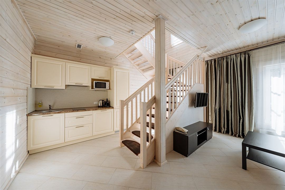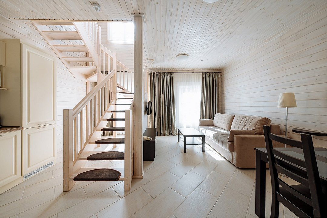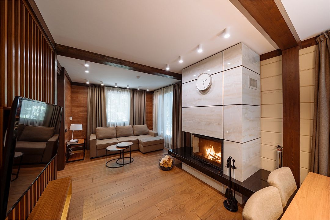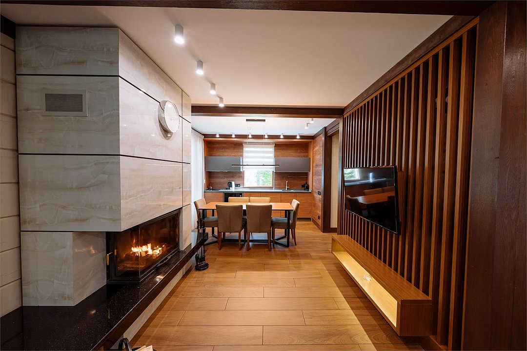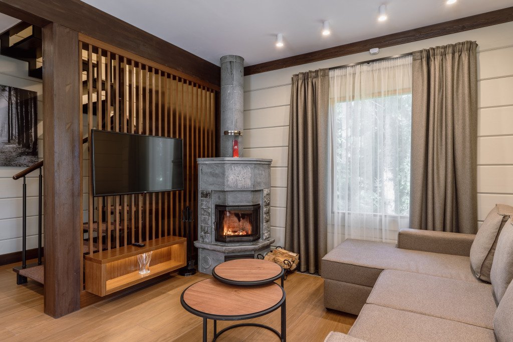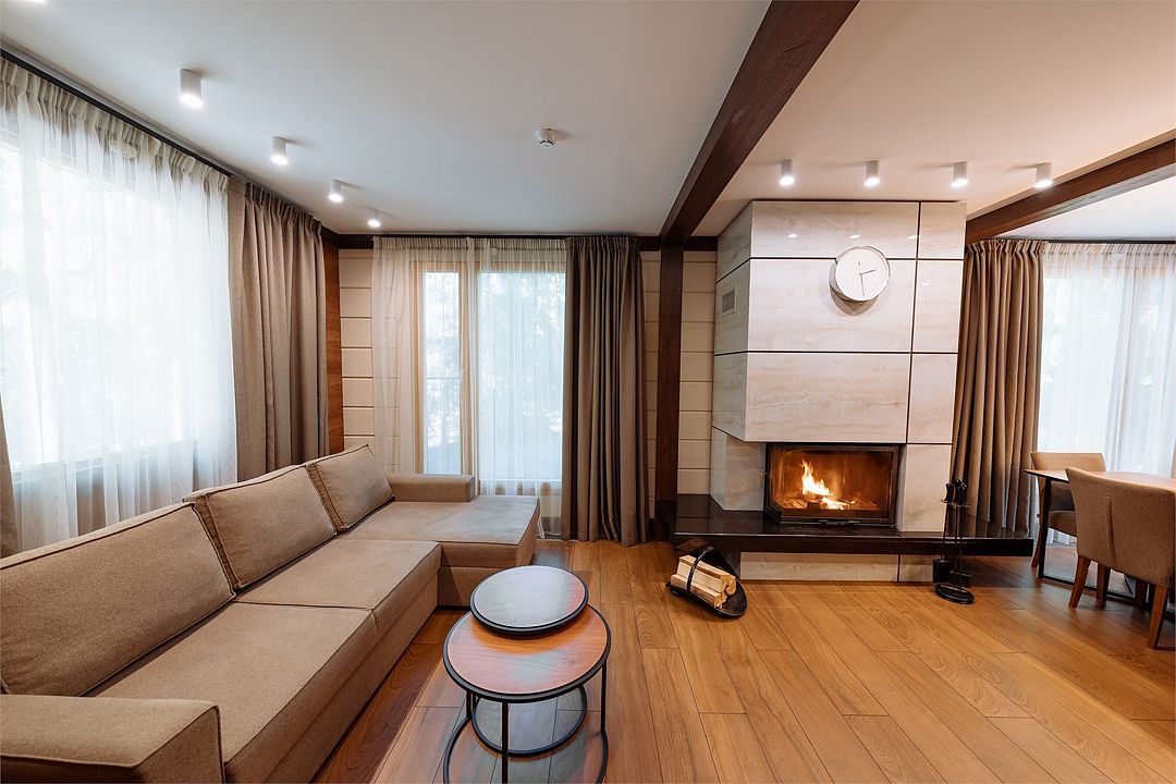 - на первом этаже коттеджа расположены современная кухня с премиальной техникой NEFF Liebherr, гостиная с камином, телевизором и обеденной зоной, терраса, сауна, сушильный шкаф, а также спальня с двумя раздельными кроватями и собственной ванной комнатой;
