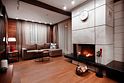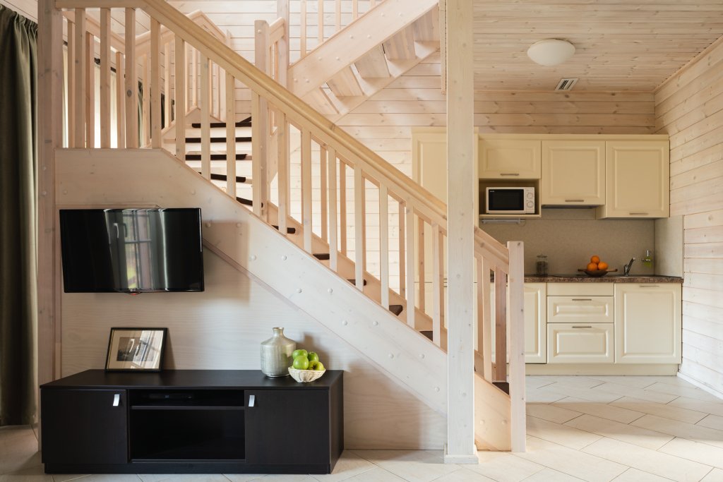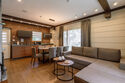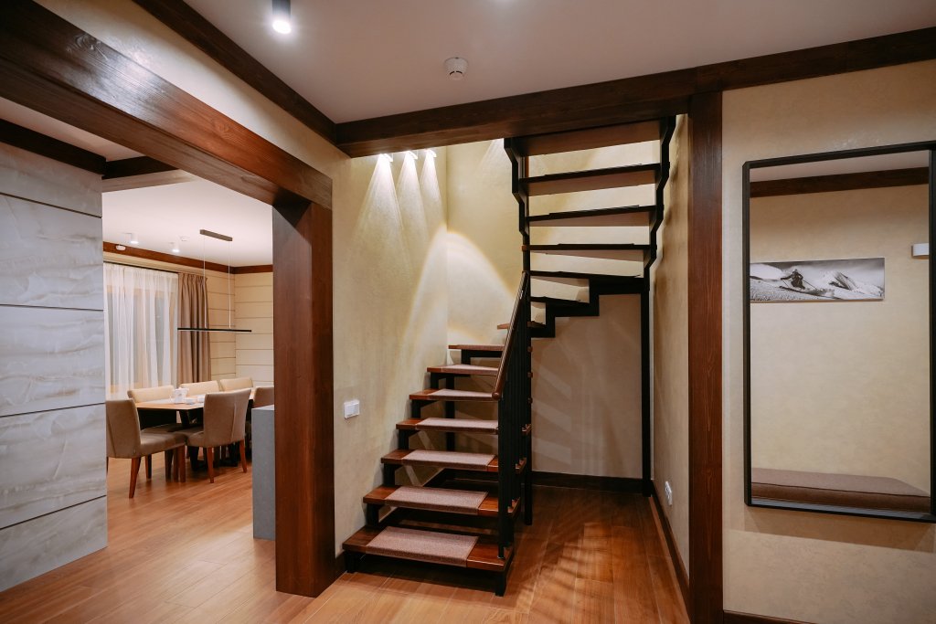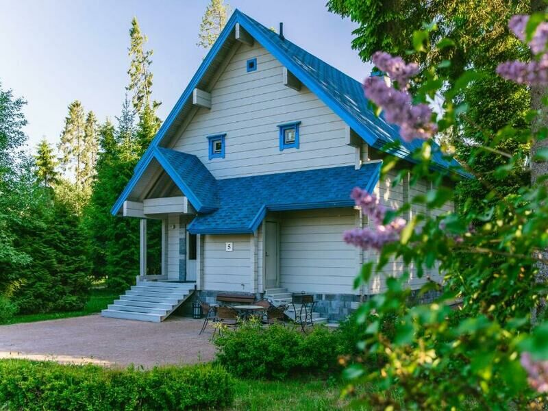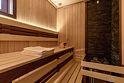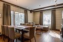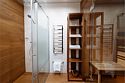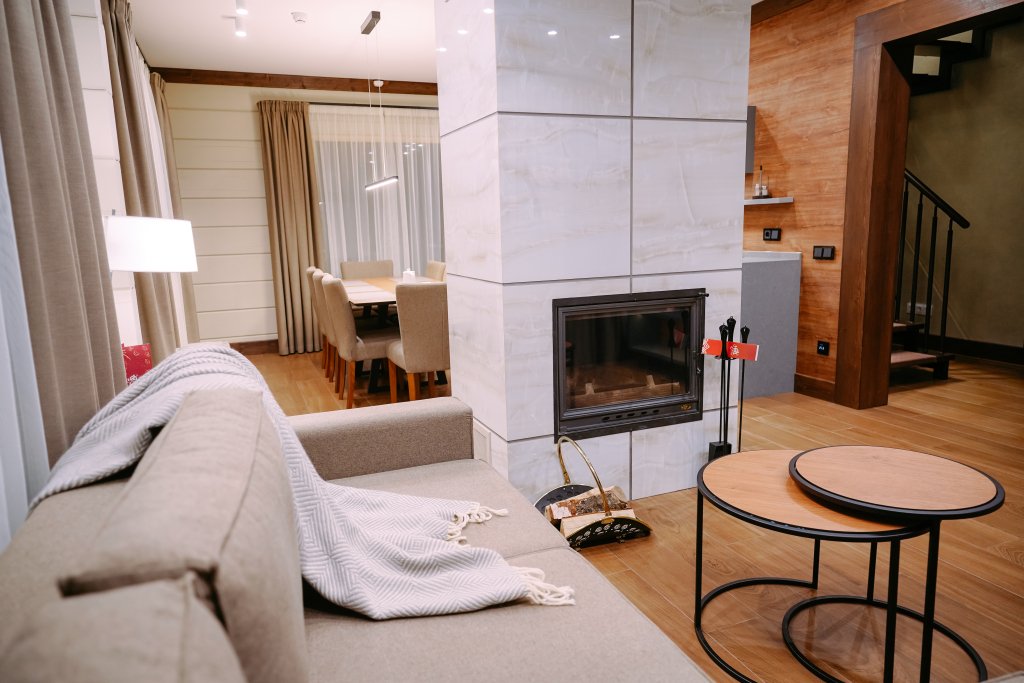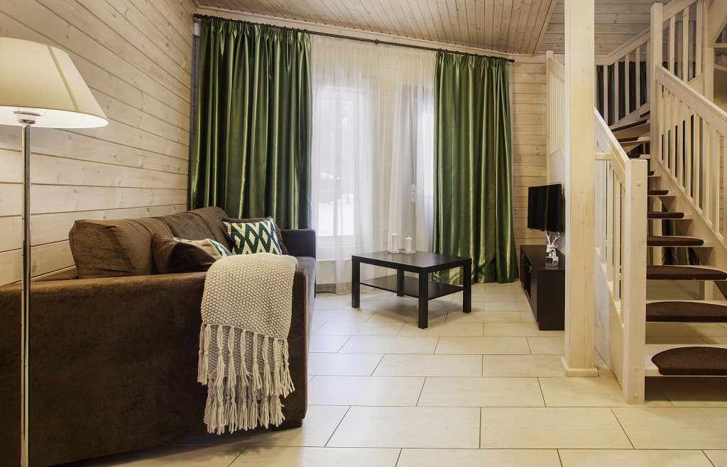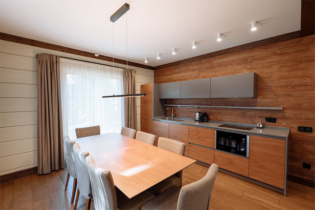 - на первом этаже коттеджа расположены современная кухня с премиальной техникой NEFF Liebherr, гостиная с камином, телевизором и обеденной зоной, терраса, сауна, сушильный шкаф, а также спальня с двумя раздельными кроватями и собственной ванной комнатой;