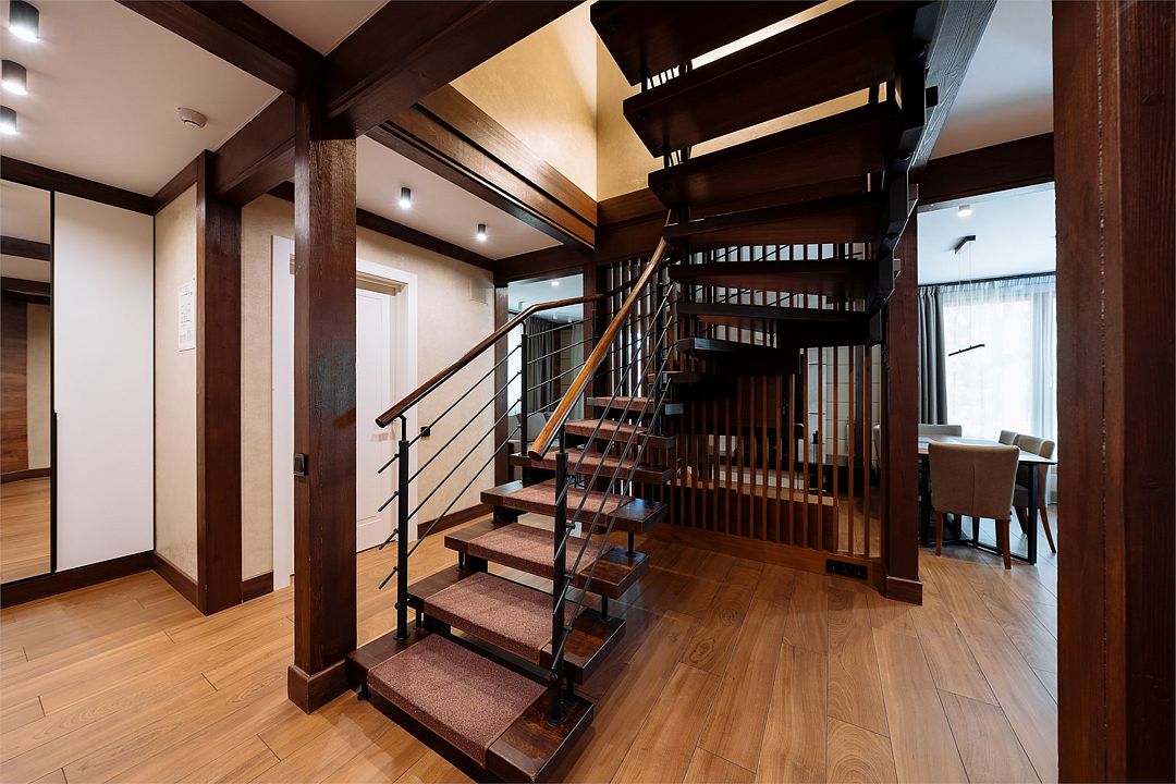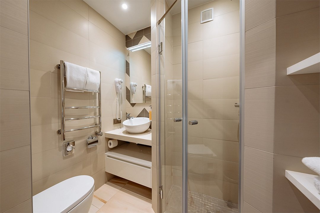 Воздушные и светлые интерьеры двухэтажных апартаментов имеют эргономичную кухонную зону, гостиную и 2 спальни с отдельными ванными комнатами.
