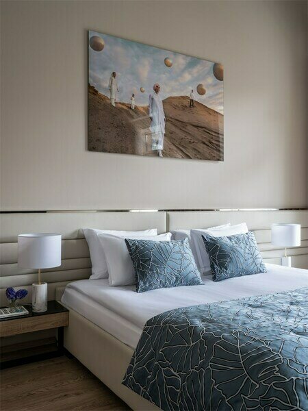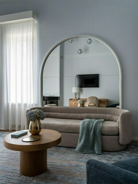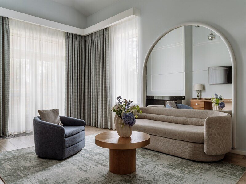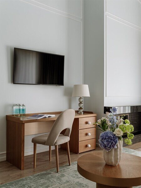 Светлые интерьеры с отделкой цвета «петербургского неба» оформлены мебелью из натуральных экологических материалов. Номер оснащен уютной гостиной с небольшой рабочей зоной, спальней и индивидуальной процедурной комнатой с авторской росписью стен.