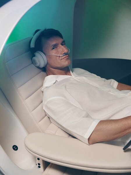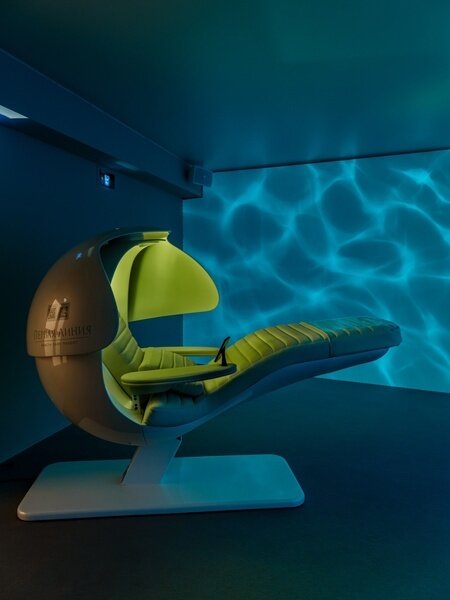 Это первая комната бесконтактной терапии на курорте. Внутри комнаты происходит воздействие на все органы чувств, взаимодействие со зрением, слухом, тактильными ощущениями, обонянием. Нахождение в комнате ментального благополучия — это честный разговор с собой, ответы на вопросы, перезагрузка на ментальном уровне, взаимодействие с мультимедиа искусством.
