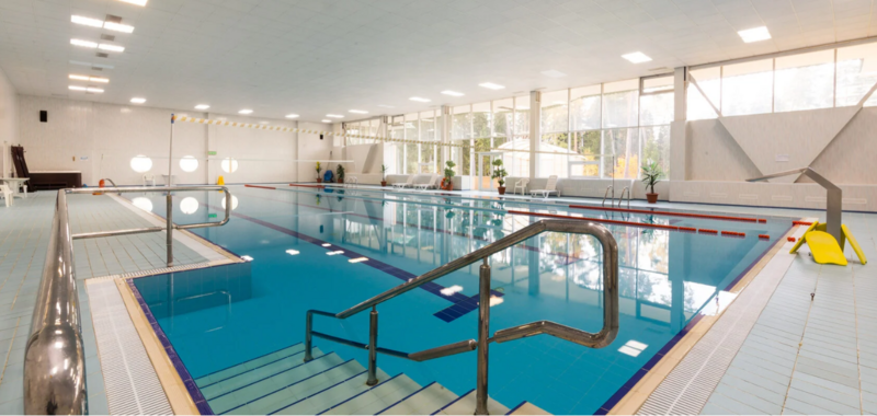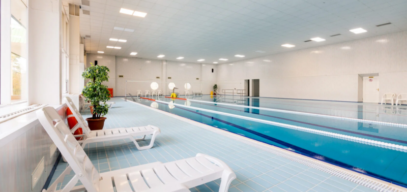 Тип бассейна: крытый бассейнВода в бассейне: подогреваемый бассейнРядом с бассейном: шезлонгиВремя работы: от 08:00 до 21:00Глубина (диапазон): от 130 до 190 смФизкультурно-оздоровительный комплекс приглашает вас посетить бассейн с тремя дорожками и отфильтрованной подогреваемой водой. Для комфортного плавания необходимы купальные принадлежности: купальный костюм, сланцы и шапочки. Гостям отеля предоставляется одно бесплатное часовое посещение бассейна ежедневно.