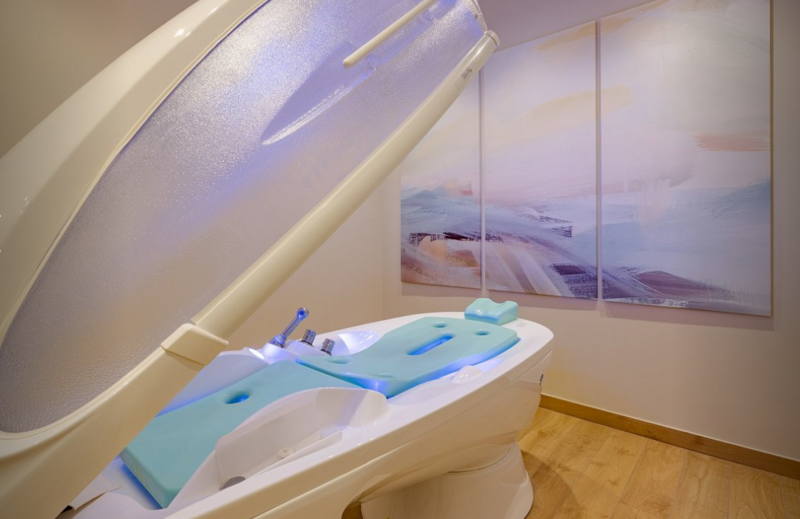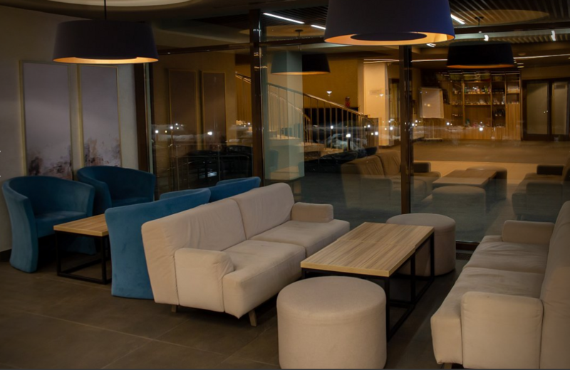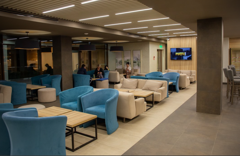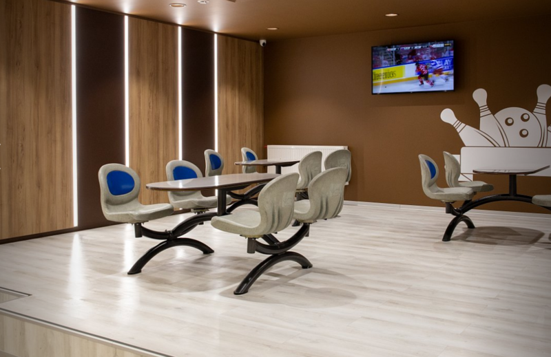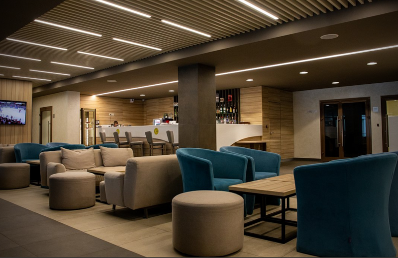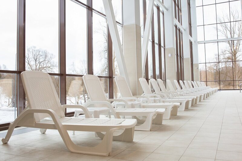 Комфортная зона отдыха. Огромные панорамные окна с видом на парк развлечений Хоббит-лэнд, приятная музыка, шезлонги с регулируемой высотой спинок, пурифаер для желающих утолить жажду, и постоянное присутствие инструкторов-спасателей создают не только комфортные, но и безопасные условия для отдыха.
