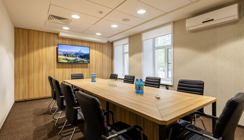 Площадь: 25 кв.м, вместимость: до 15 человек, зал оборудован плазменной панелью, стационарным столом переговоров. Естественное освещение.