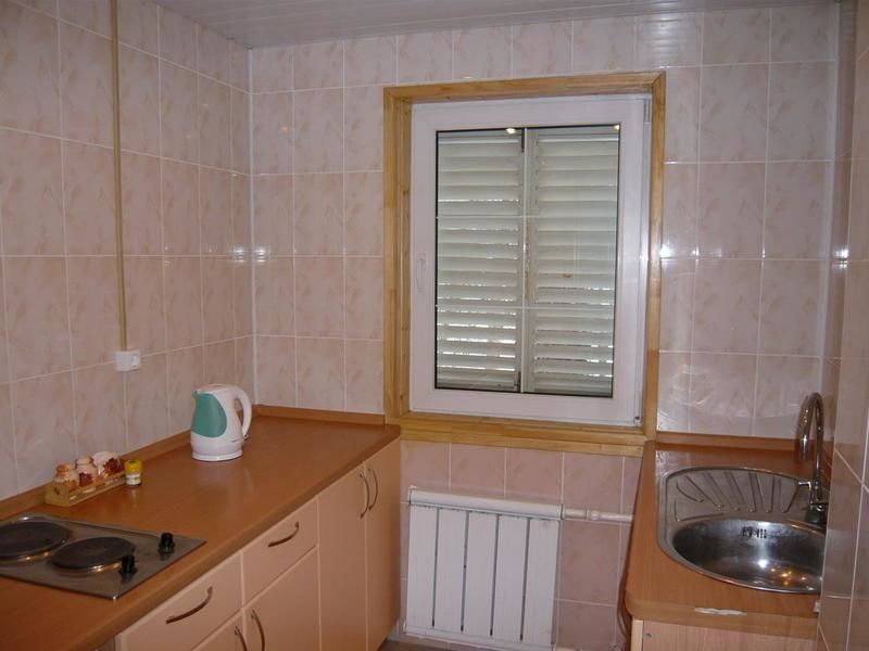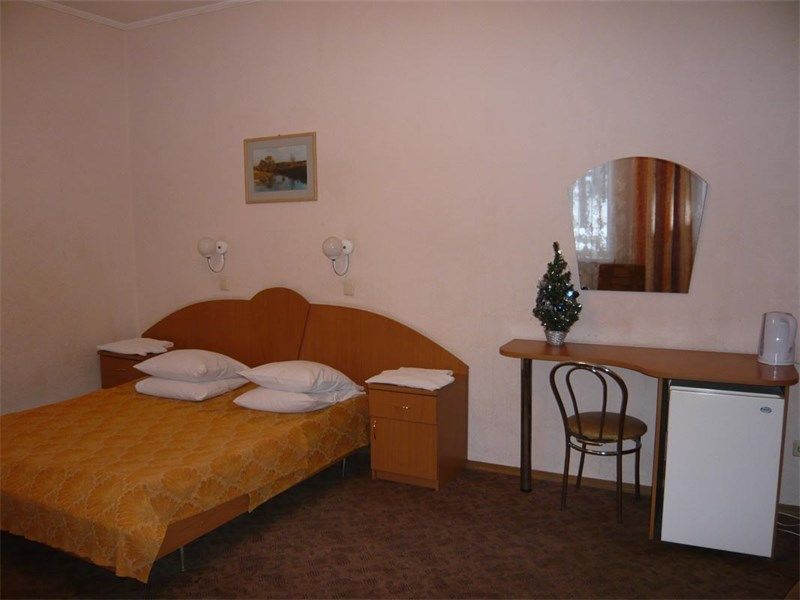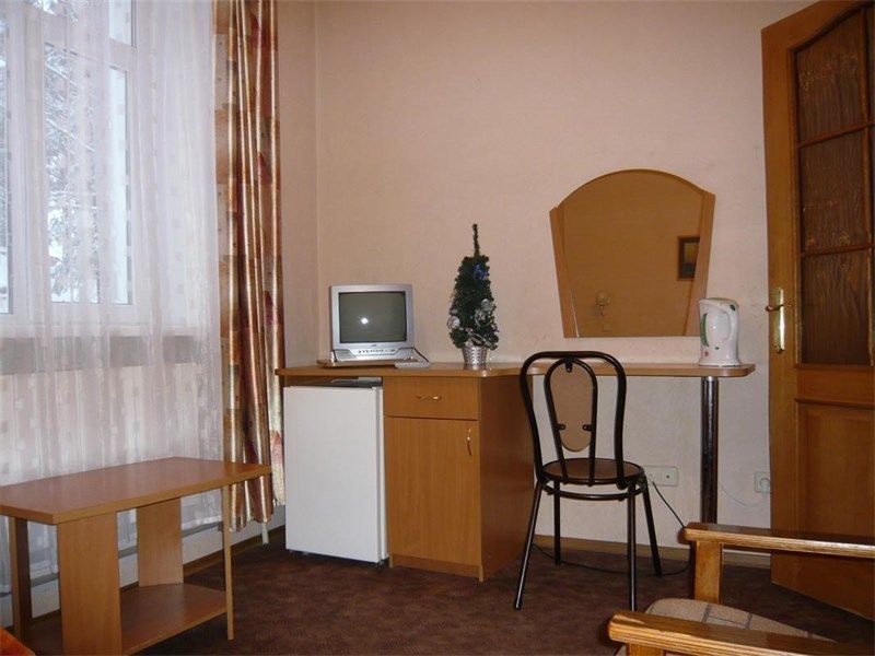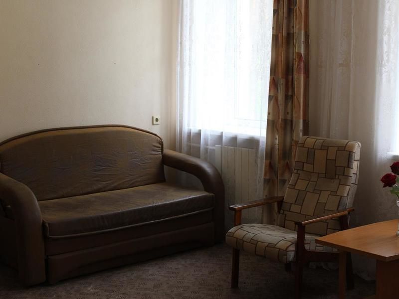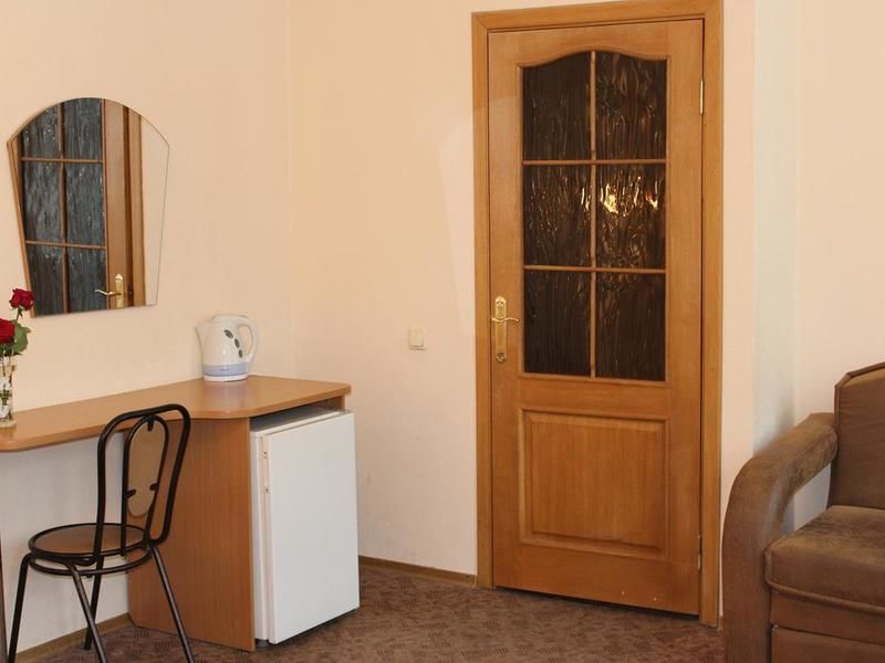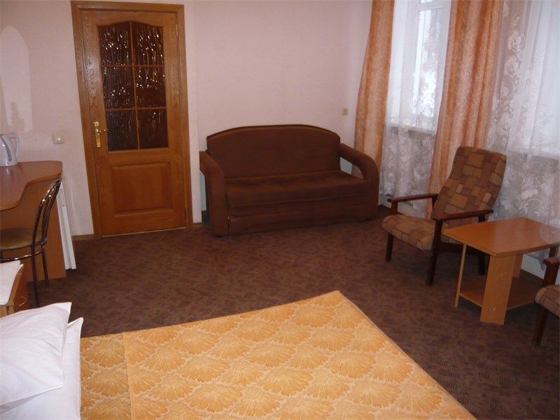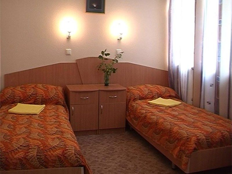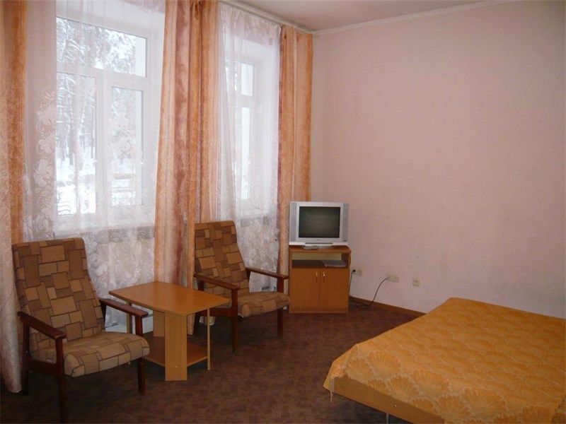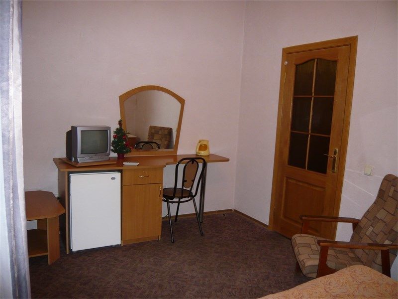 19 номеров. Комната: две 1,5-спальные кровати, тумбочки, бра, туалетный столик, мини-холодильник, электрочайник, чайная посуда, стул, журнальный столик, кресло, TV.