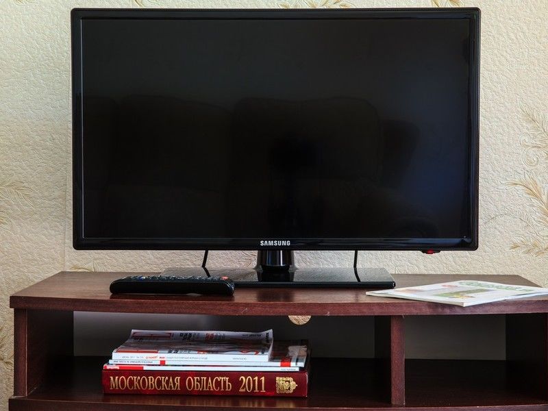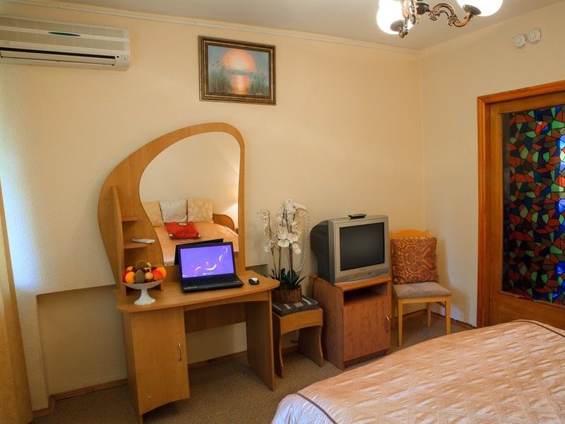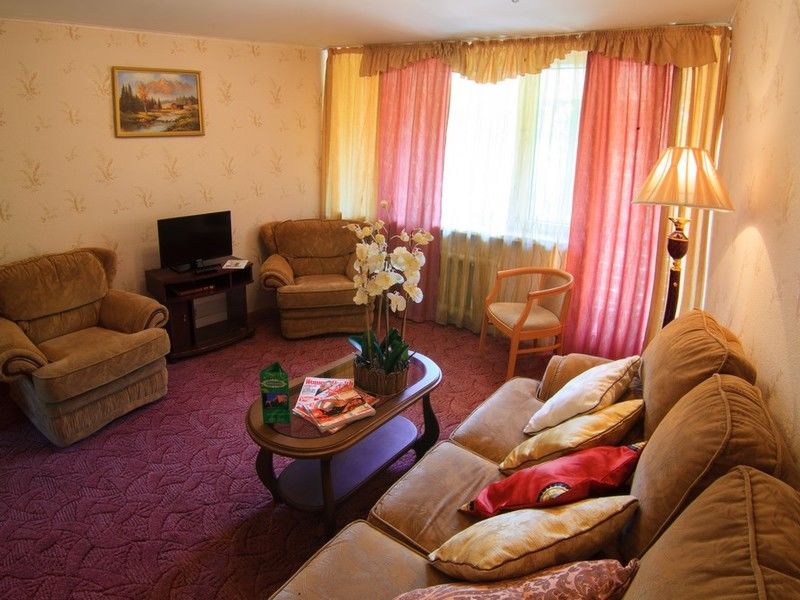 В номере одна 2-х спальная кровать, две прикроватные тумбочки, 2 настольные лампы, зеркало, письменный стол, стул, тумба с телевизором, кресло-кровать, комбинированный шкаф с отделениями для белья и для верхней одежды , холодильник, поднос с кувшином и 2-мя стаканами. При входе в номер – вешалка для одежды. В ванной комнате (санузел совмещённый) - душ, туалетные принадлежности. В номере выход на лоджию с видом на лес. На полу – ковровое покрытие.
