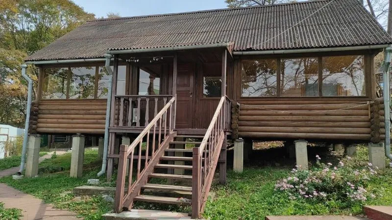 Домик из круглого бревна, рассчитан на пребывание большой семьи или двух пар, с двумя двух-трех местными спальными комнатами, выходящими на общую остекленную веранду, используемую как гостевую.