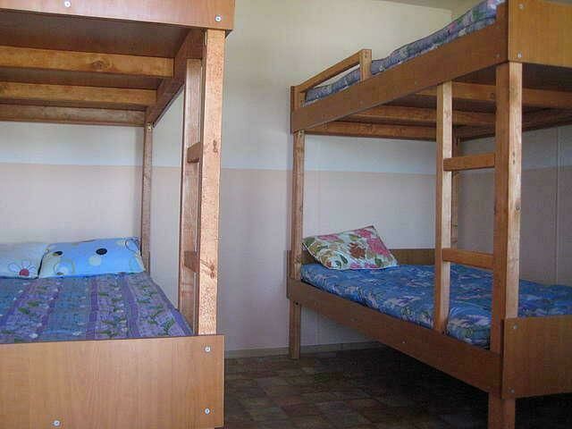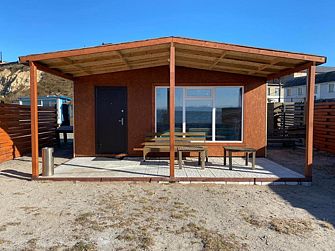 Оснащён двумя двухъярусными 1,5-спальными кроватями, холодильником, тумбочками. На крытой веранде - стол и лавочки. Рядом с домиком находится кухня, для самостоятельного приготовления пищи. Кухня рассчитана на три домика.