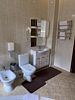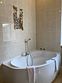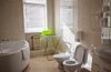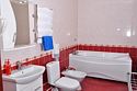 В ванной нет шторки совсем. При этом сама ванная весьма просторная, но принимать душ можно только сидя, иначе всё залито.