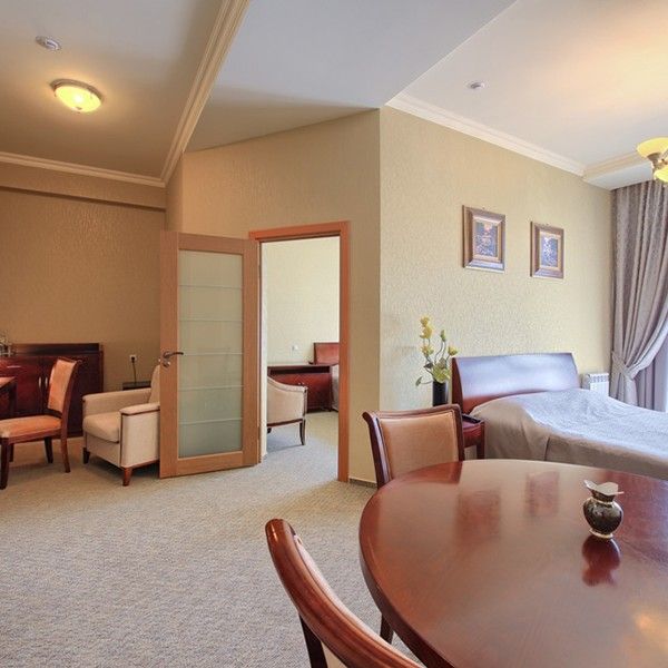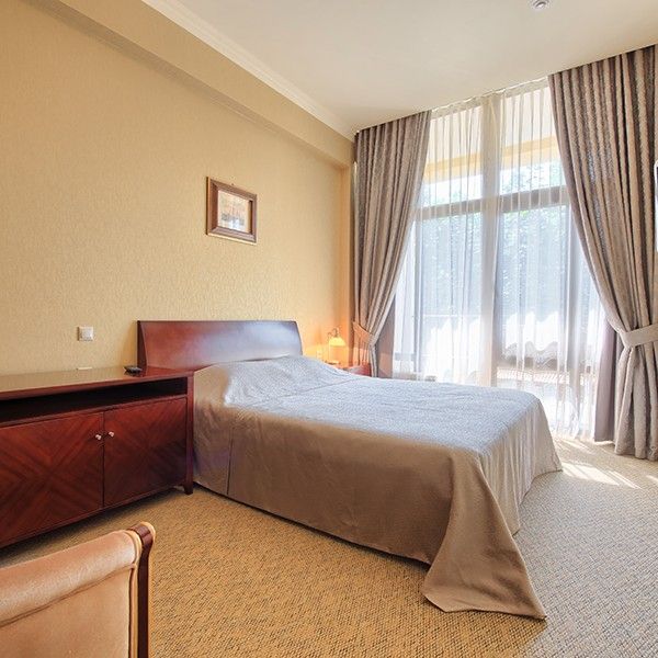 Уютный двухкомнатный номер. Мебель в классическом стиле, широкая двуспальная кровать. Выгодное сочетание практичности и минимализма.