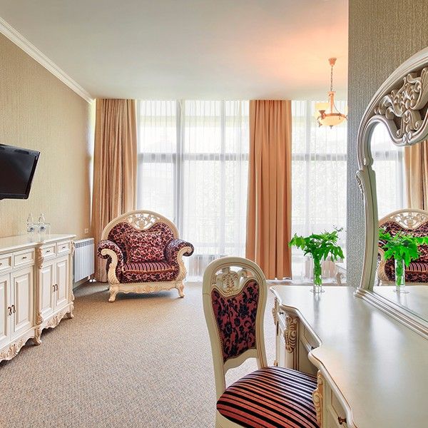интерьер номера выполнен в классическом итальянском стиле с присущей ему вычурностью и дороговизной обстановки. В гостиной комнате расположен итальянский мебельный гарнитур – удобный диван и два кресла, журнальный столик для чаепитий. Также здесь есть туалетный столик с уже приготовленным набором различных косметических средствУслуги и удобства