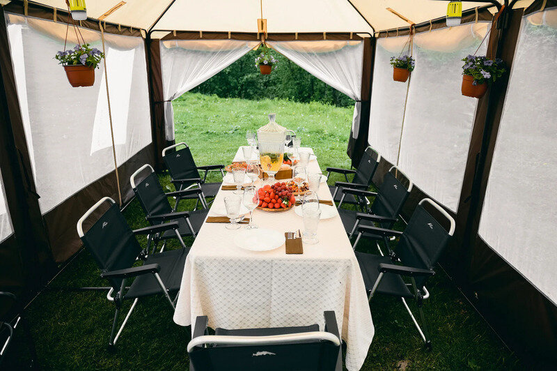 - кемпинговый крытый шатер с защитной сеткой от москитов, со столом и стульями;