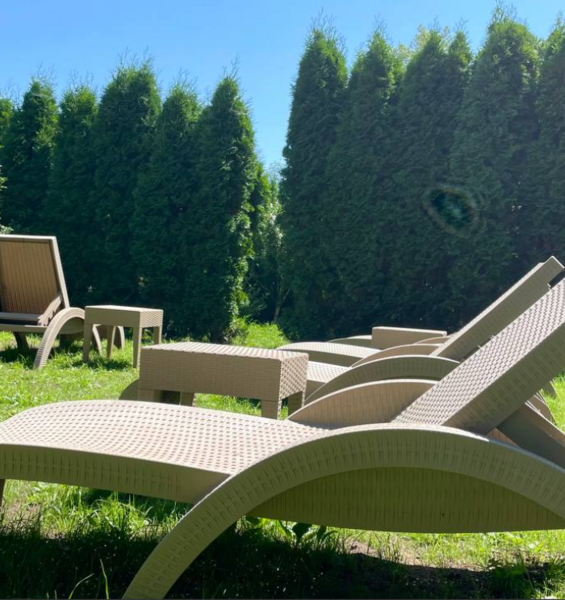 Инфраструктура: лежаки, зонтики, шезлонгиНа заднем дворе пансионата, в огороженном туями уголке располагаются новые и удобные лежаки с индивидуальными столиками. Такая процедура по принятию солнечных ванн называется климатолечением. Услуга аэросолярия предоставляется без дополнительной оплаты.
