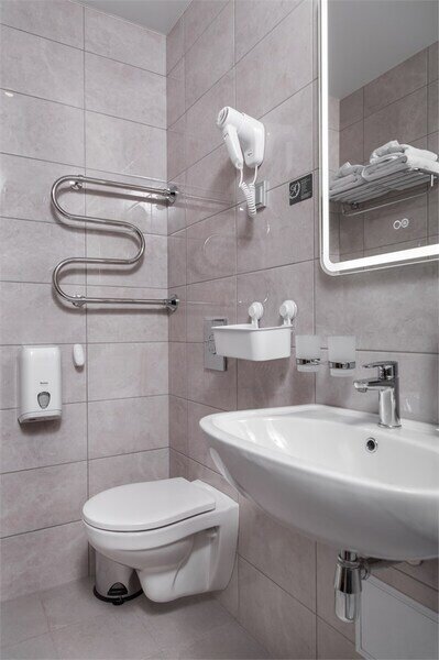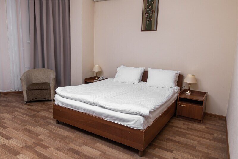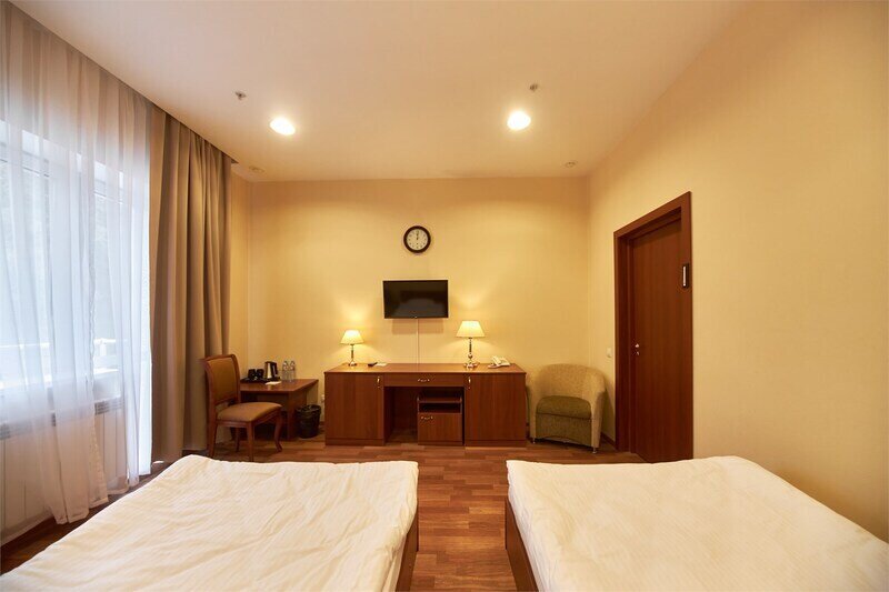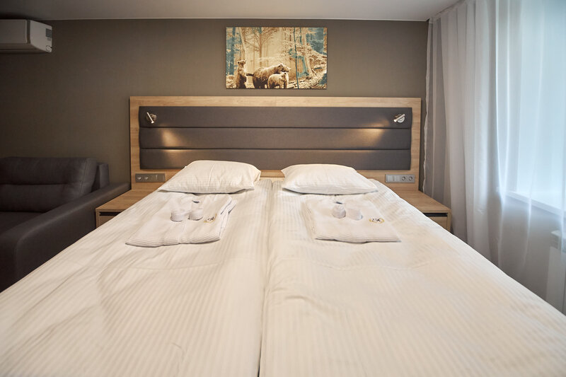 Двухместный номер «Бизнес» — номер, состоящий из уютной спальни с двумя односпальными кроватями или одной двуспальной кроватью, диваном, ванной комнаты с душевой зоной, с рабочей зоной. Все продумано для вашего удобства. В номере данной категории возможно размещение 3 человек.