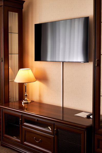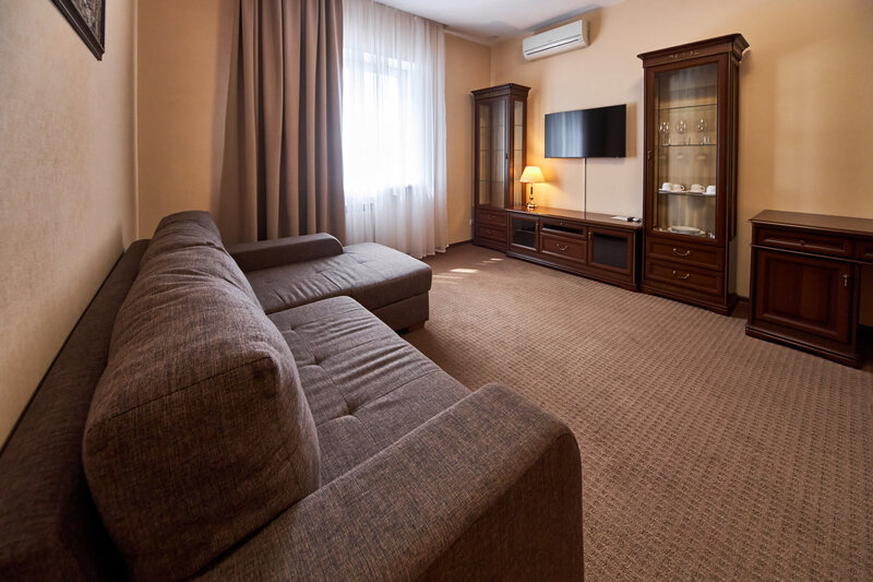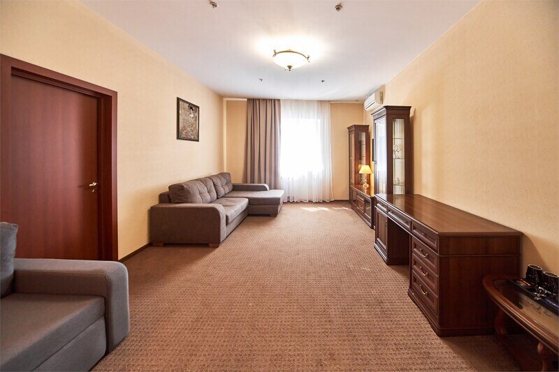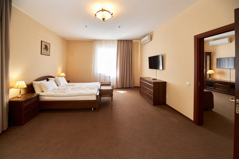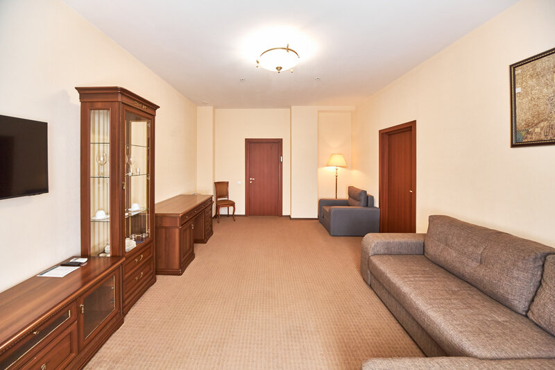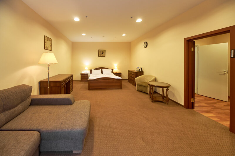 В номере просторная спальня с двуспальной кроватью, письменным столом, шкафом, телевизором; гостиная с раскладывающимся двуспальным диваном, телевизором, гостиной мебелью. Особенность номера в наличии двух санузлов, в одном из которых душевая кабина и ванна.
