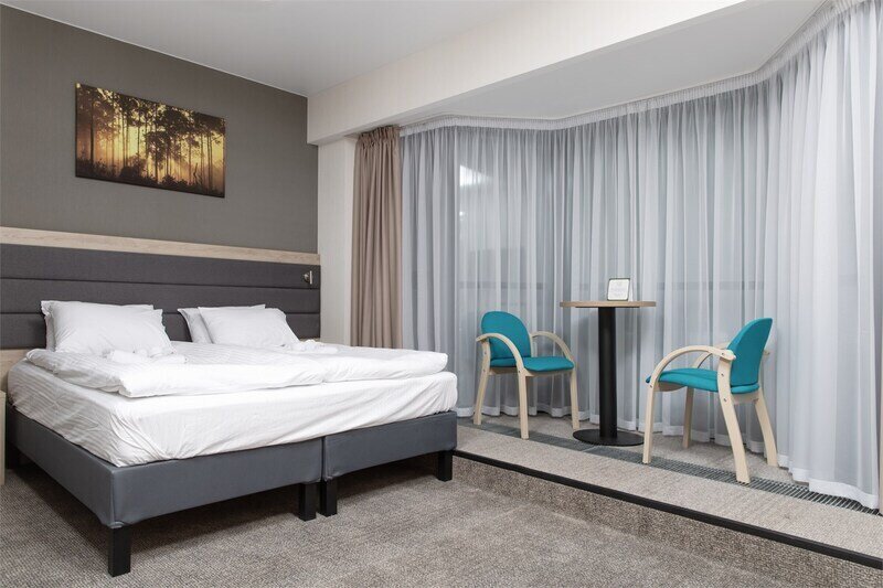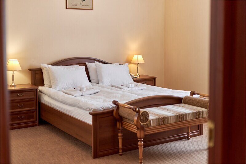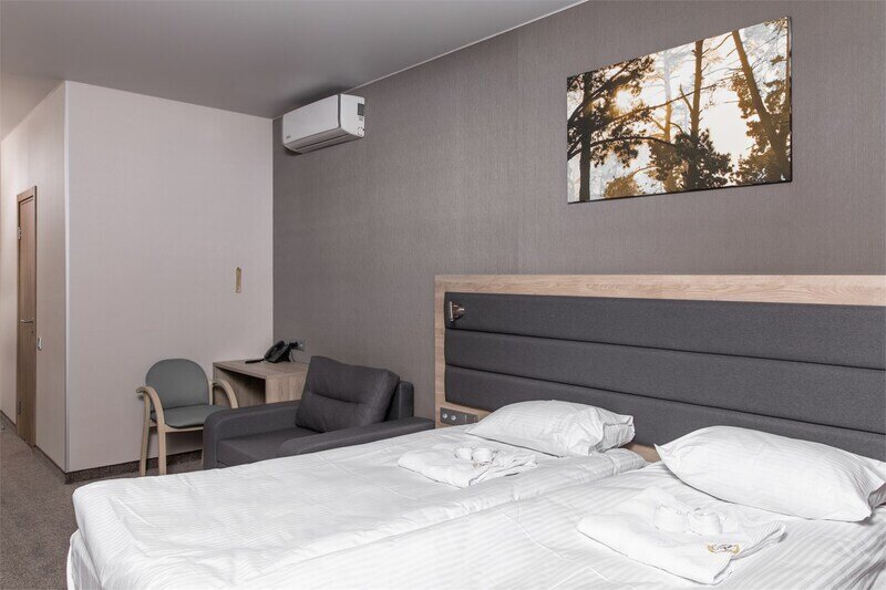 Двухместный номер «Бизнес» предназначен для спокойного отдыха и лечения. В номере — уютная спальня с двуспальной кроватью, диваном и письменным столом, шкаф для одежды, санузел с душевой зоной. Из окна уютного номера открывается прекрасный вид на лес.