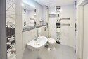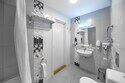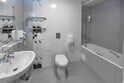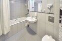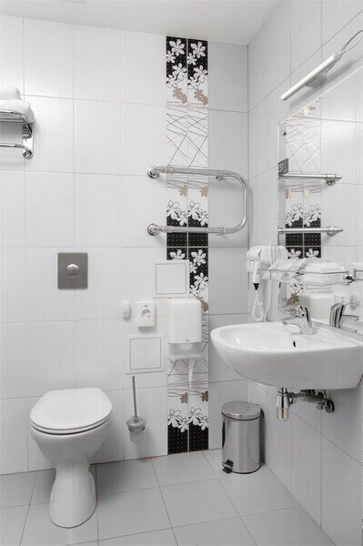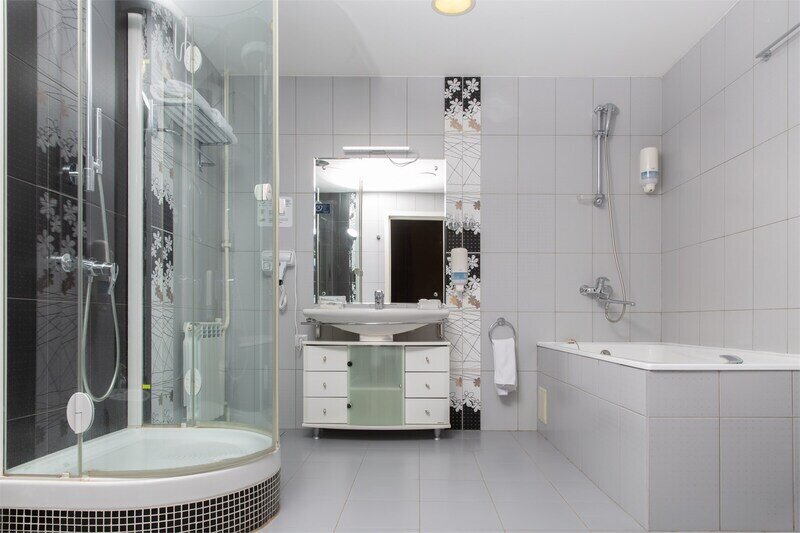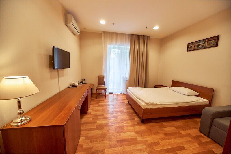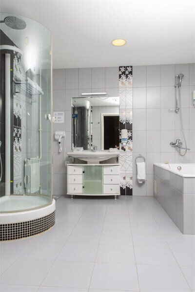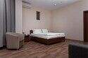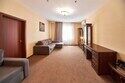 В номере просторная комната с двуспальной кроватью, раскладывающимся диваном, письменным столом, телевизором, гостиной мебелью. Особенность номера в наличии двух санузлов, в одном из которых душевая кабина и ванна.