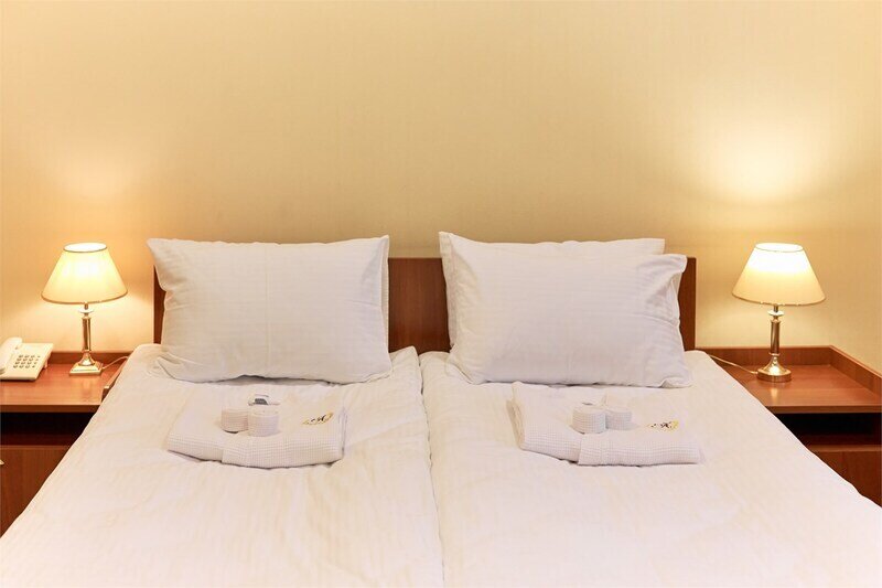 Уютный двухместный номер небольшой по площади, с двумя односпальными кроватями и ванной комнатой.