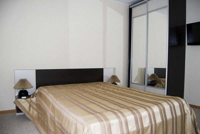 В спальной комнате: двуспальная кровать, 2 прикроватные тумбочки, платяной шкаф, TV.