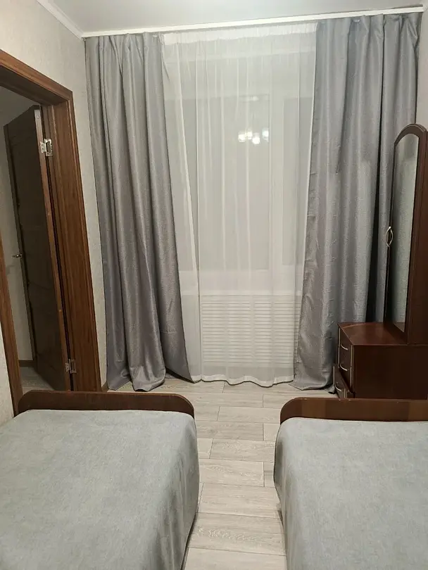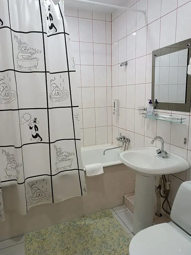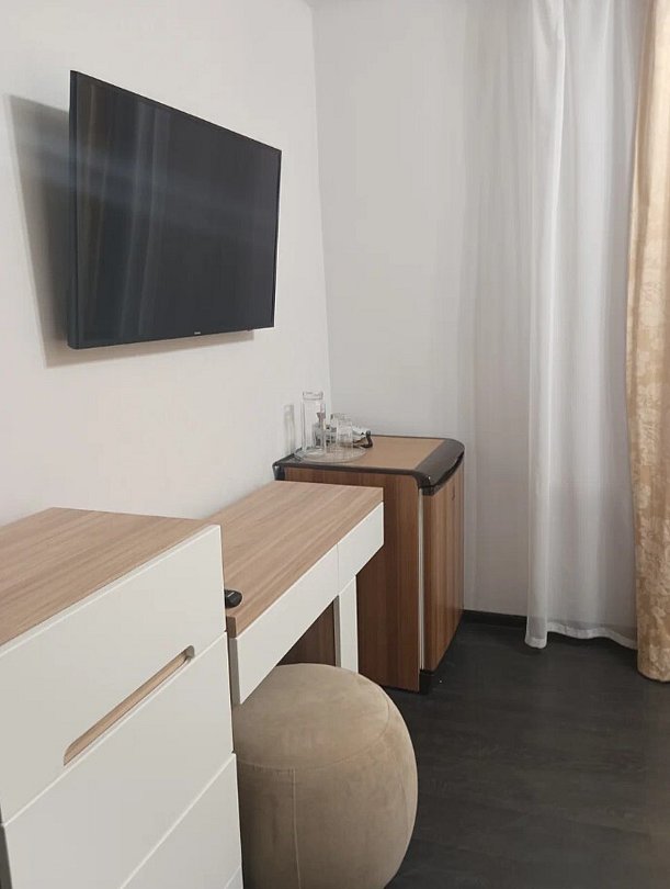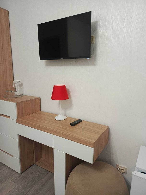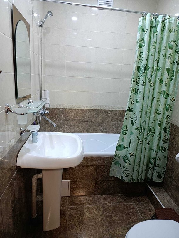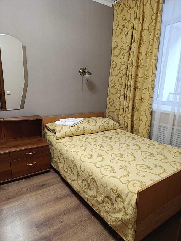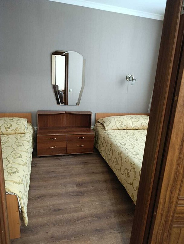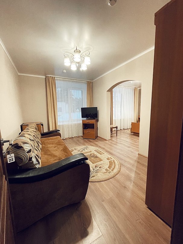 Уютный и светлый номер с просторной лоджией. В номере — прихожая, спальная зона — две отдельные кровати и гостиная. В гостиной зоне есть удобный раскладной диван, который может служить дополнительным местом для двух гостей, а также телевизор и холодильник. В номере персональная ванная комната с ванной, и туалетными принадлежностями.
