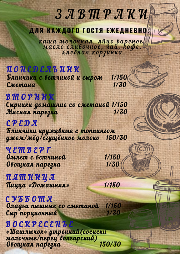 - питание: трехразовое-Тематическое (2 завтрака, 2 обеда, 2 ужина);