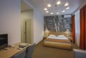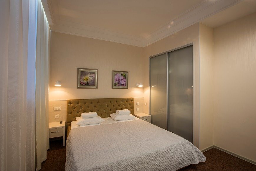 Люкс состоит из двух больших комнат, оформленных в дизайнерском решении, создающих романтическую обстановку для гостей, приезжающих сюда отдохнуть. В спальне двуспальная кровать (немецкий ортопедический матрас, чехол выполнен из высококачественного гипоаллергенного жаккарда, постельное белье производства Германия).