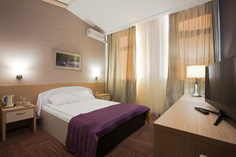 Уютный номер с удобной современной мебелью. Одна полутороспальная или двуспальная кровать (ортопедический матрас производства Германия с чехлом из высококачественного гипоаллергенного жаккарда), туалетный столик, встроенный холодильник, ЖК-телевизор, кондиционер, кресла, прикроватные тумбы, в прихожей встроенный шкаф для одежды, сейф.