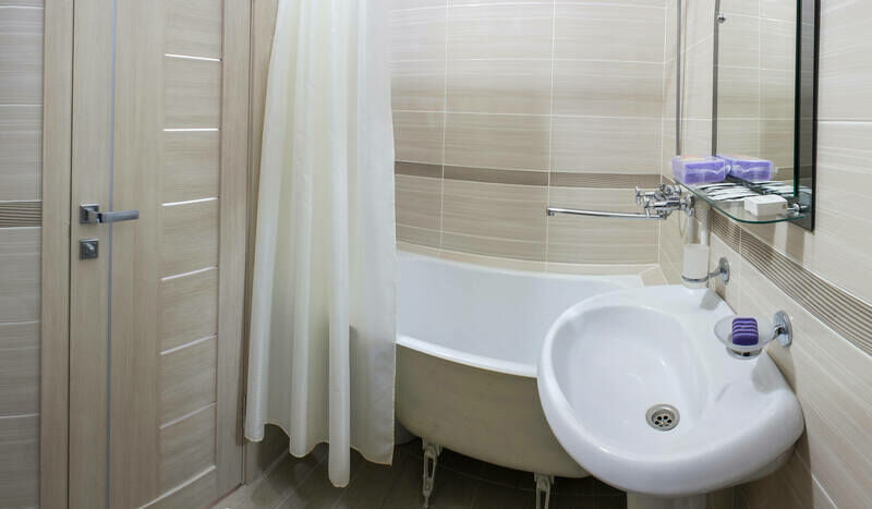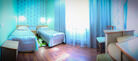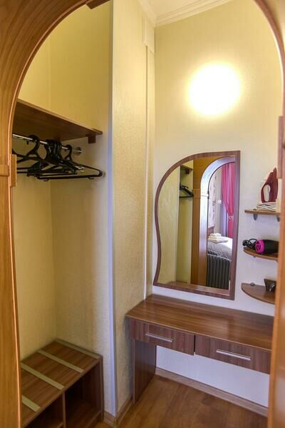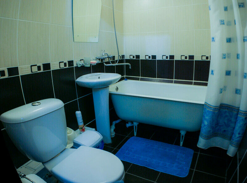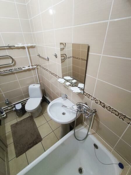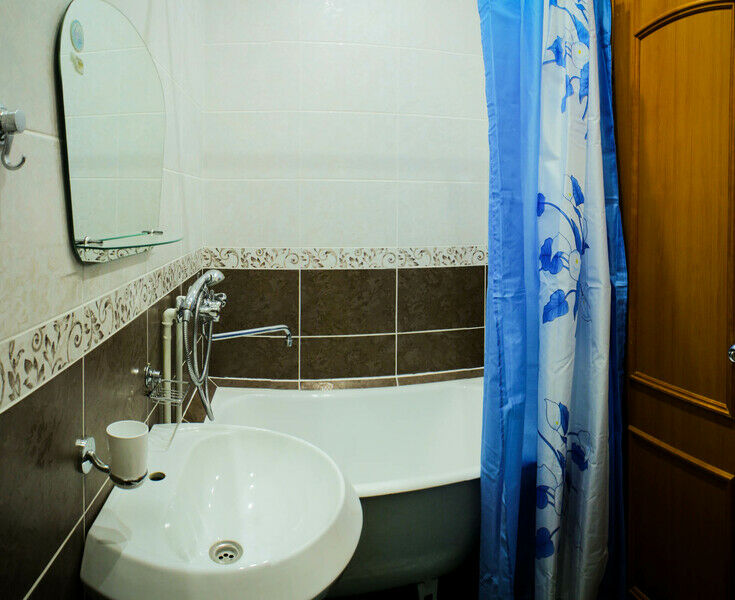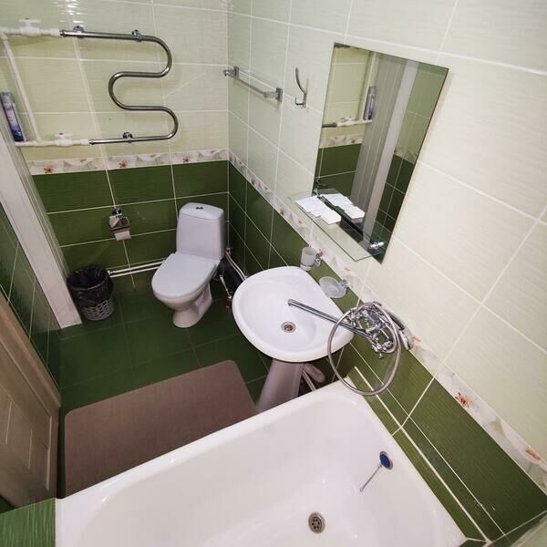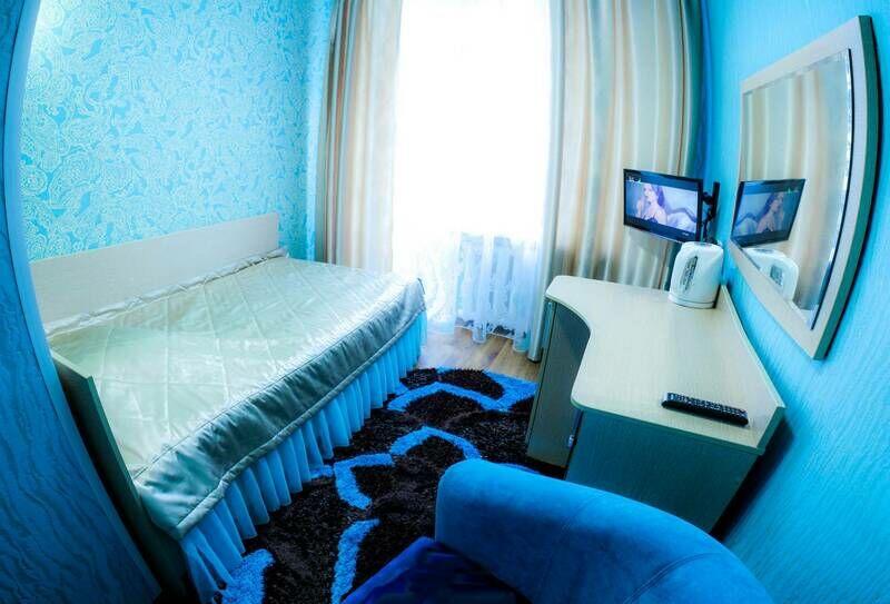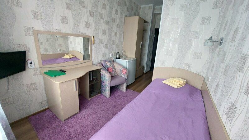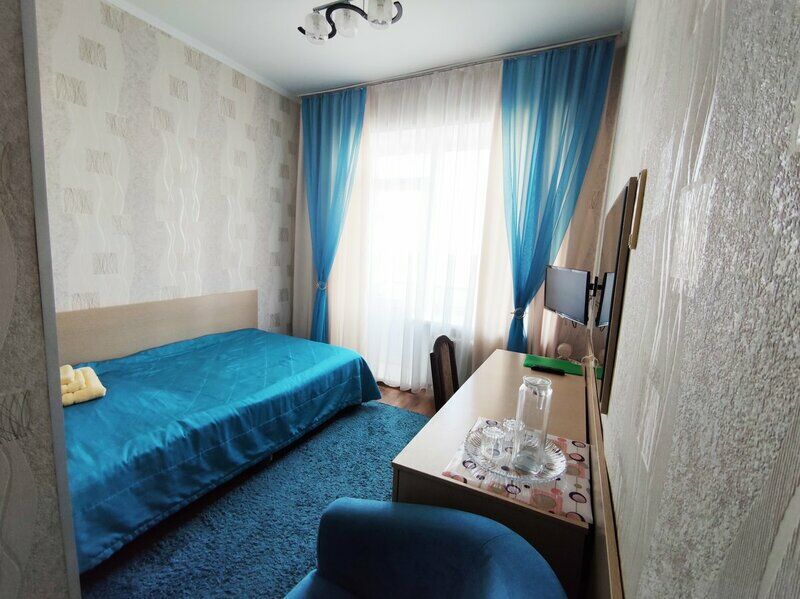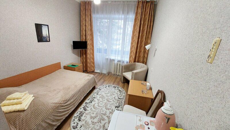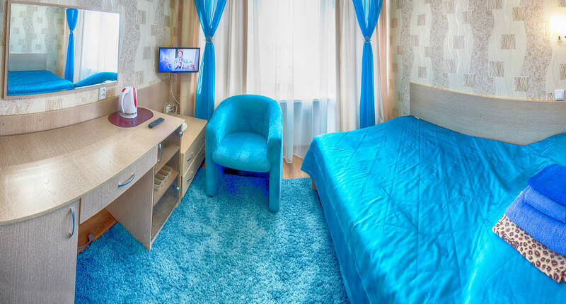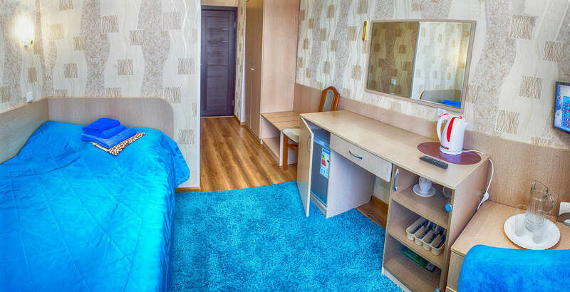 В номере: холодильник, телевизор, ванна/душ, раковина, WC (в номере), 2 кровати, шкаф платяной, стол журнальный, стул, тумбочка, коврик, графин со стаканами.